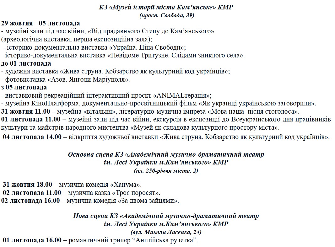 В Музее истории города Каменское представлена археологическая экспозиция «Від прадавнього Степу до Кам’янського» и документальные выставки «Україна. Ціна Свободи» и «Невідоме Тритузне. Слідами зниклого села». Продолжаются художественная выставка «Жива струна. Кобзарство як культурний код українців» и фотовыставка «Азов. Янголи Маріуполя». 31 октября состоится литературно-музыкальное мероприятие «Мова наша – пісня стоголоса».