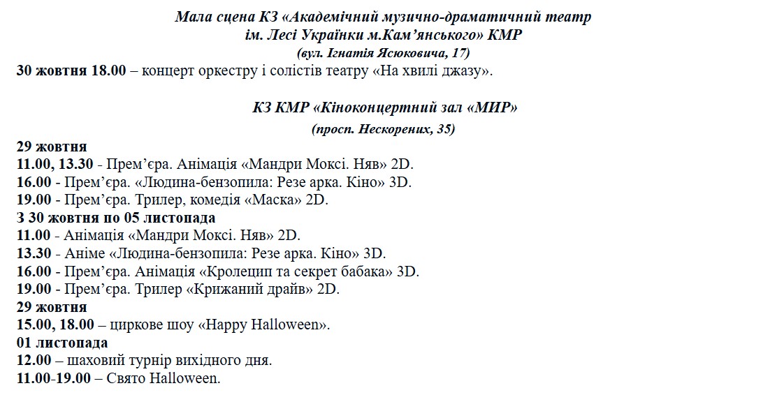 В киноконцертном зале «Мир» будут демонстрироваться премьеры: «Путешествия Мокси. Мяу», «Ледяной драйв», «Маска», «Человек-бензопила: Рез арка. Кино» и «Кролецып и Сурок Времени». Также запланированы цирковое шоу Happy Halloween и праздничные мероприятия к Хэллоуину.