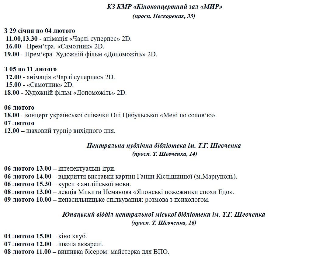 В киноконцертном зале «Мир» пройдут показы анимации и художественных фильмов, премьеры, шахматный турнир выходного дня и концерт Оли Цибульской «Мені по солов’ю».