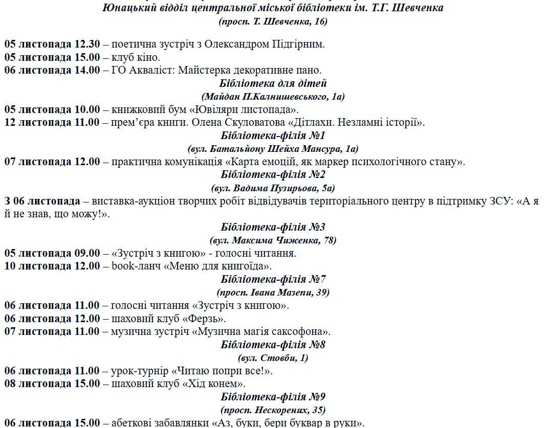 В библиотеках города – творческие мастерские, выставки в поддержку ВСУ и презентации книг. Центральная библиотека им. Т. Шевченко, детская, юношеская и филиалы приглашают присоединиться к чтению, рисованию, общению и развитию.