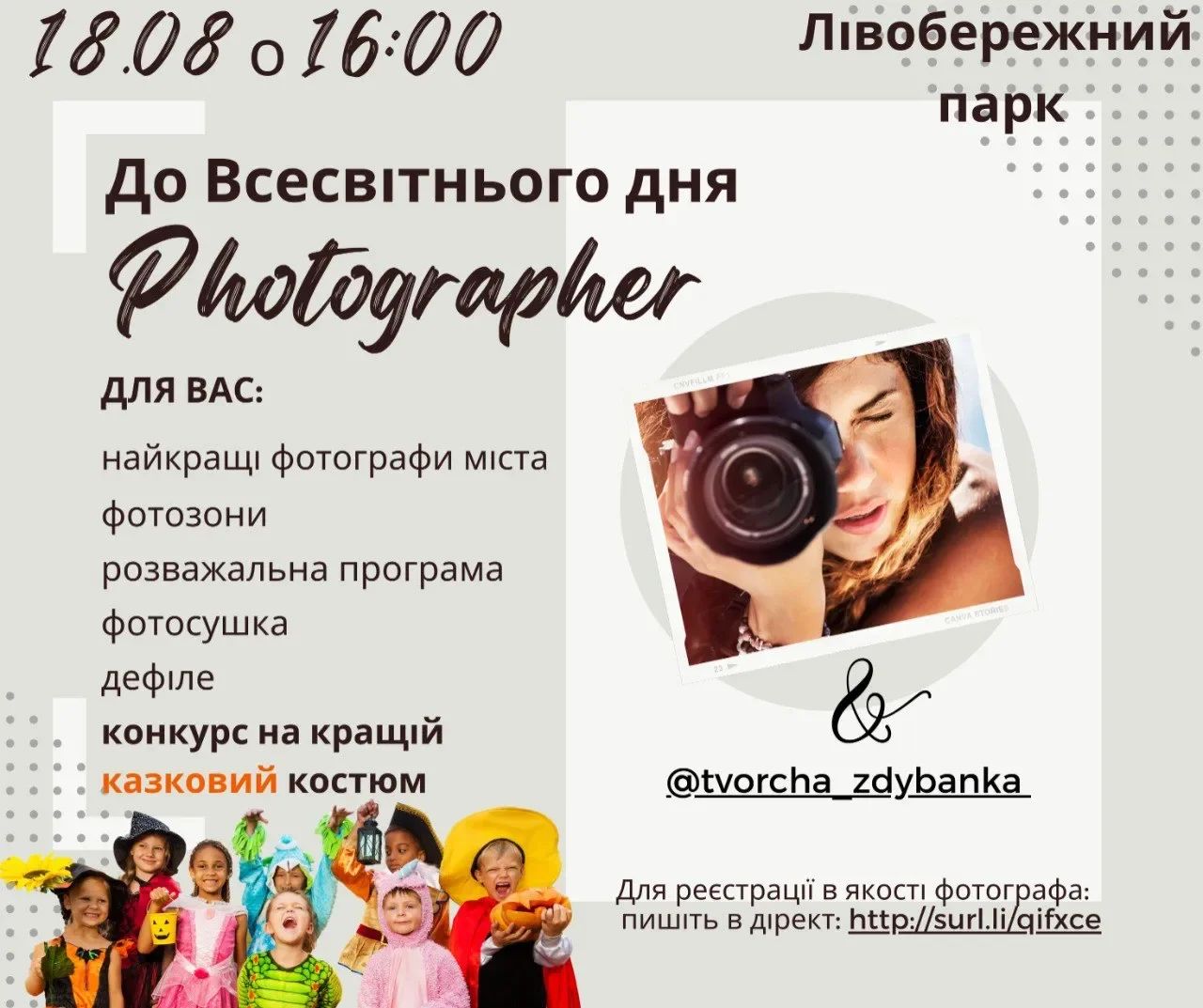 В Левобережном парке 18 августа отметят Всемирный день фотографии. Начало – в 16:00. Мероприятие проведет КП “Парки Каменского” совместно с tvorcha_zdybanka.