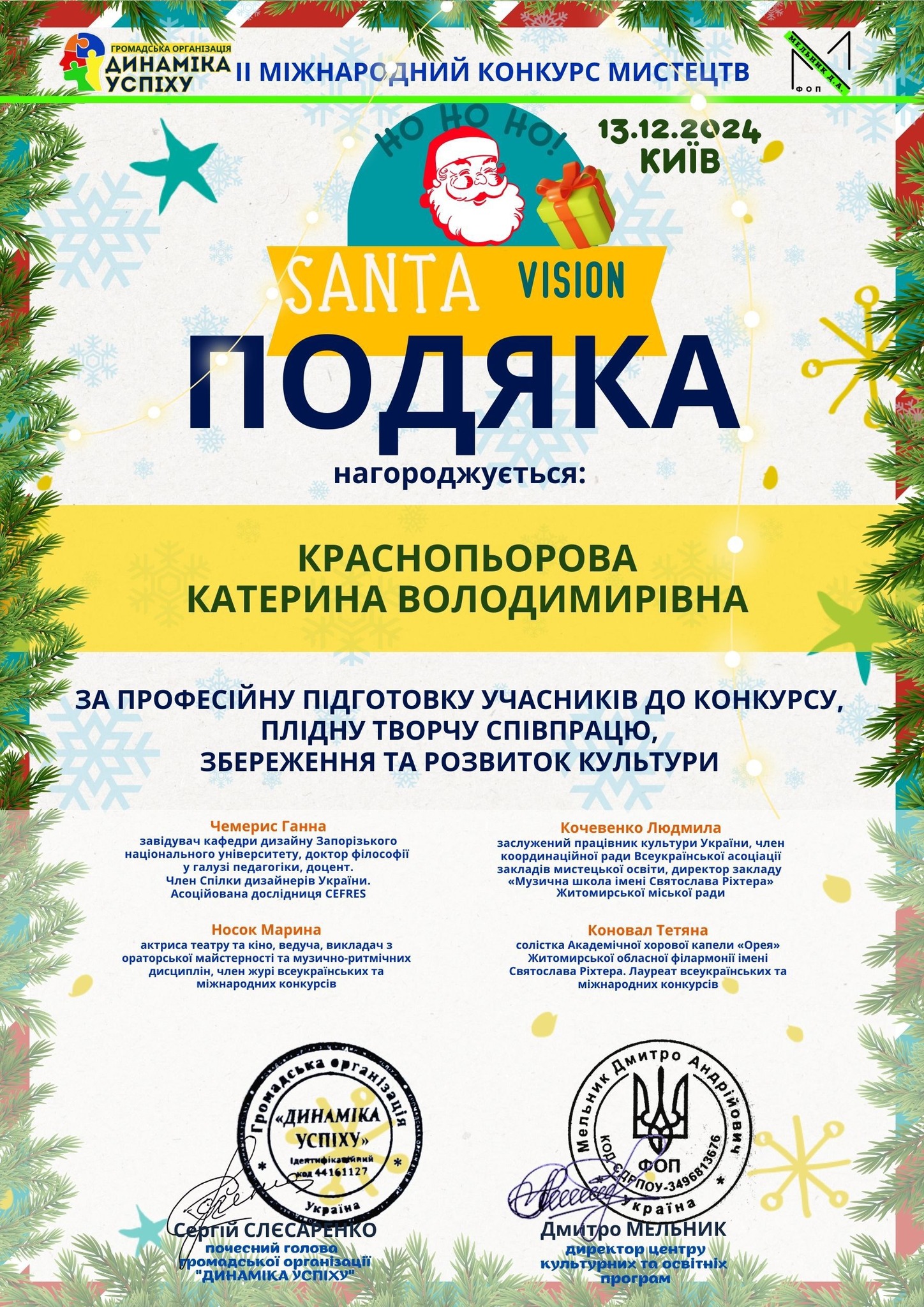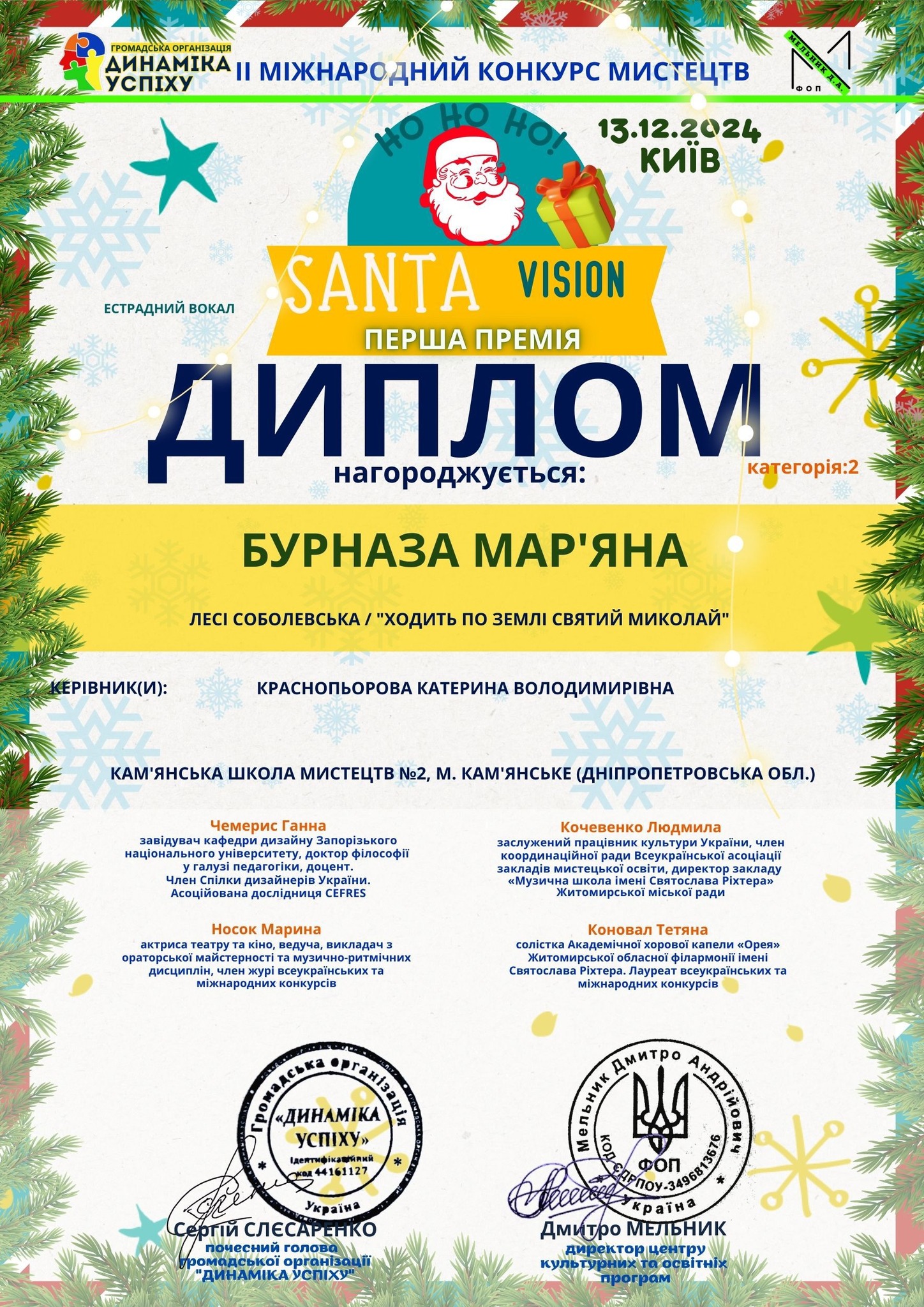 Маленькая вокалистка спела песню Леси Соболевской “Ходить по землі святий Миколай”. Трогательное выступление Марьянки достойно оценили на II Международном конкурсе искусств Santa Vision, итоги которого подвели 13 декабря в Киеве.