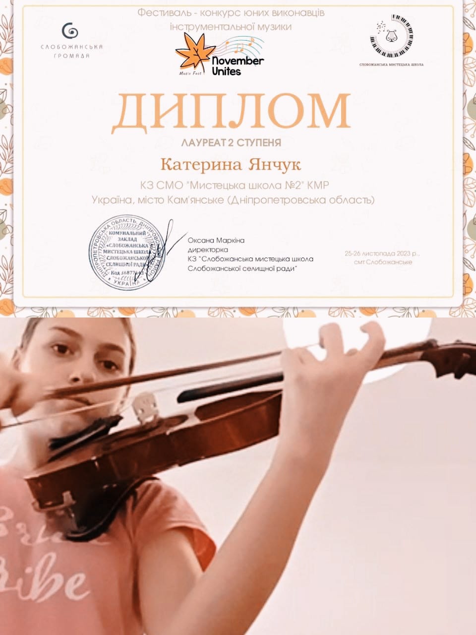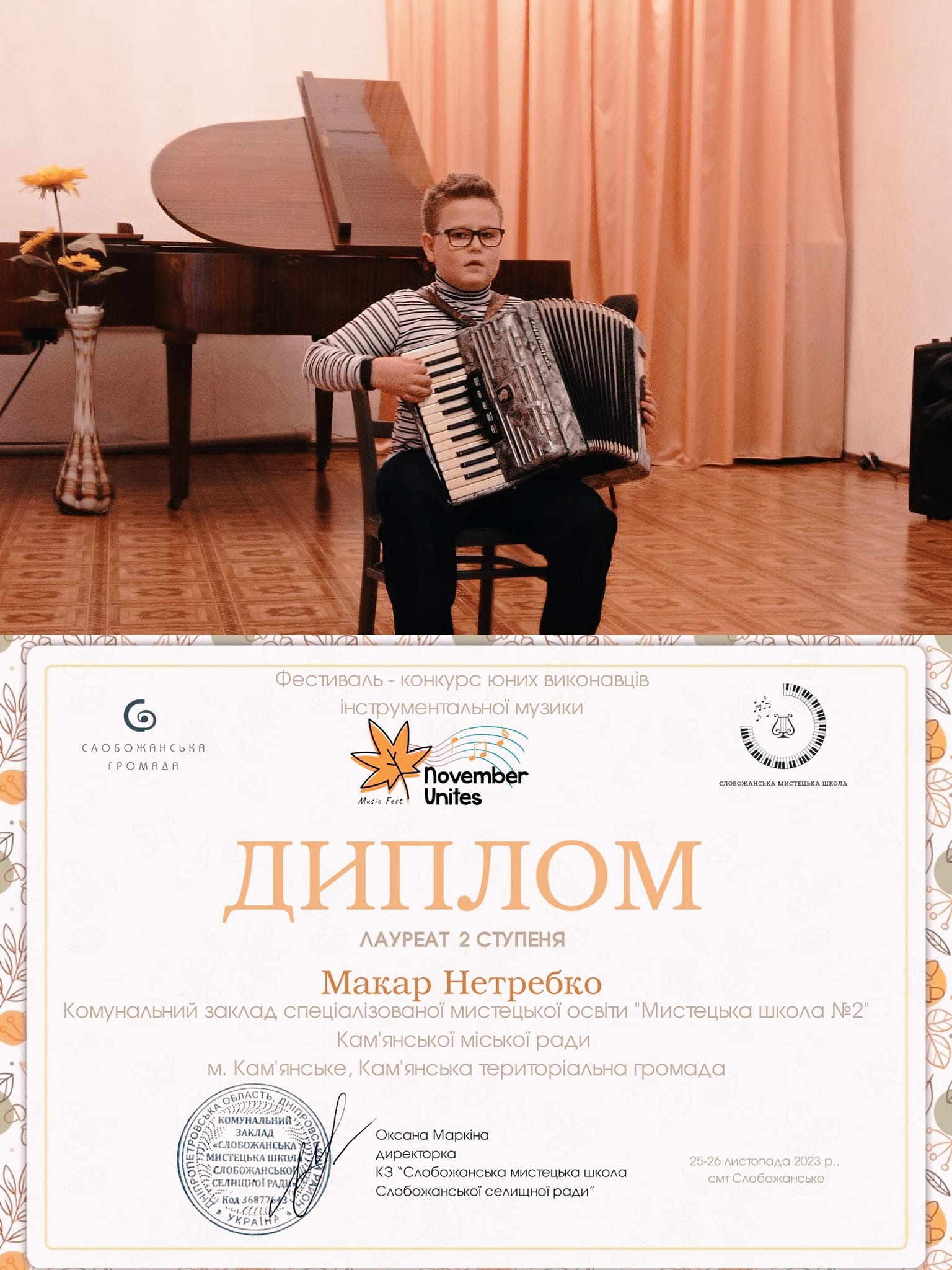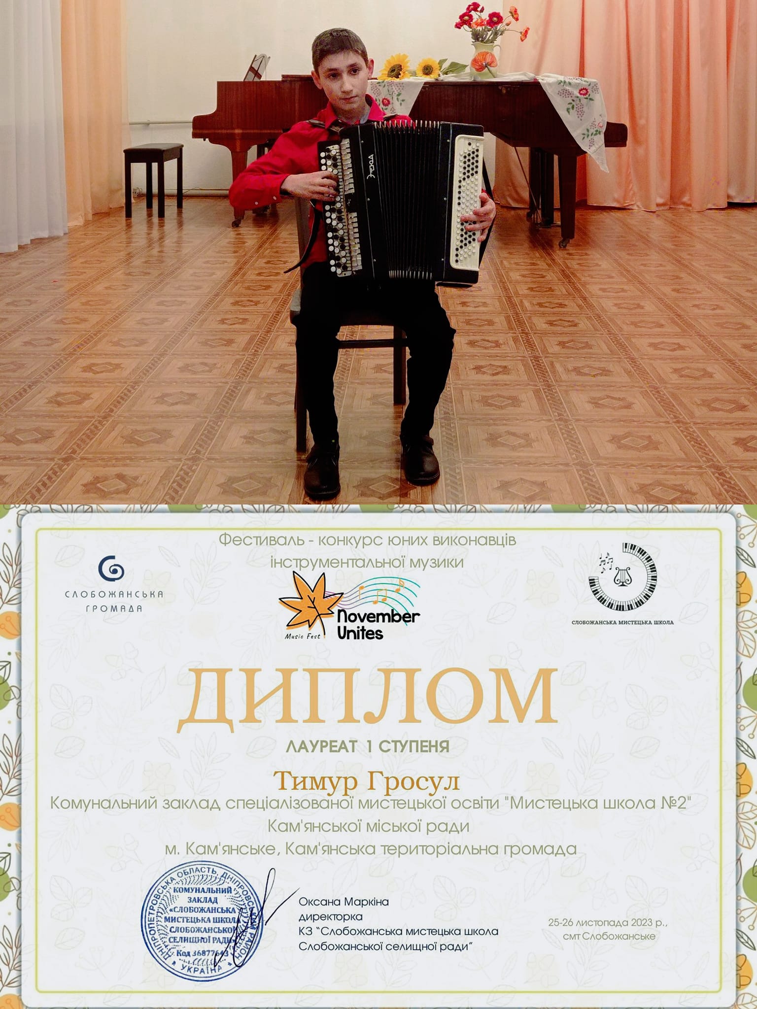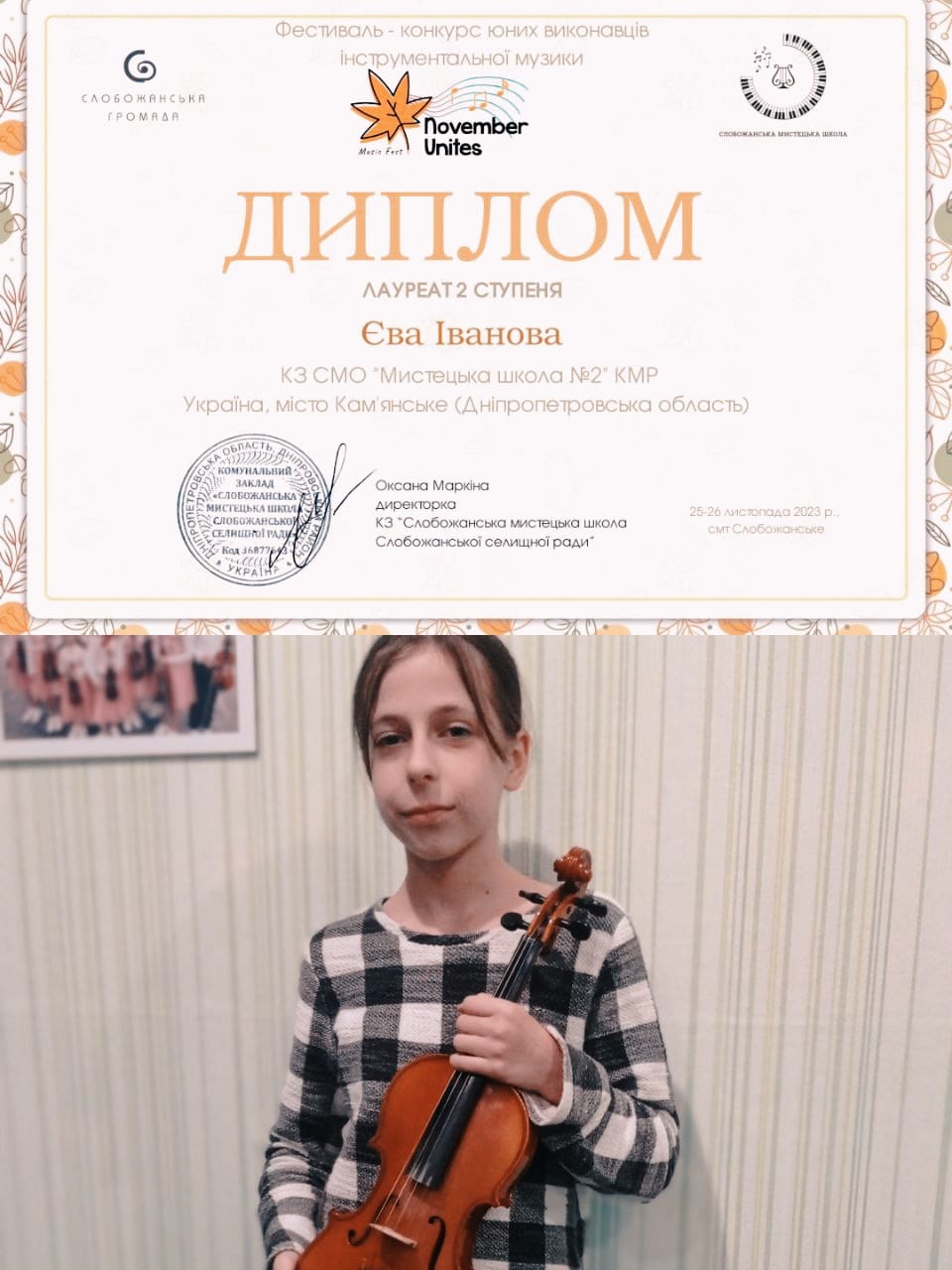 Преподавателей (Мария Шевченко, Елена Зинченко) и концертмейстера Лилию Бигун отметили благодарностями за профессиональную подготовку участников к конкурсу, сохранение лучших традиций украинской исполнительской школы игры на музыкальных инструментах, творческое воспитание подрастающего поколения.