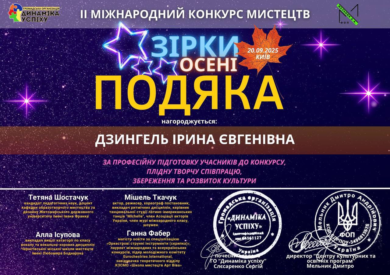 Ирина Дзингель получила от ОО “Динамика успеха” (организатор) благодарность за профессиональную подготовку участницы к конкурсу, плодотворное творческое сотрудничество, сохранение и развитие культуры.