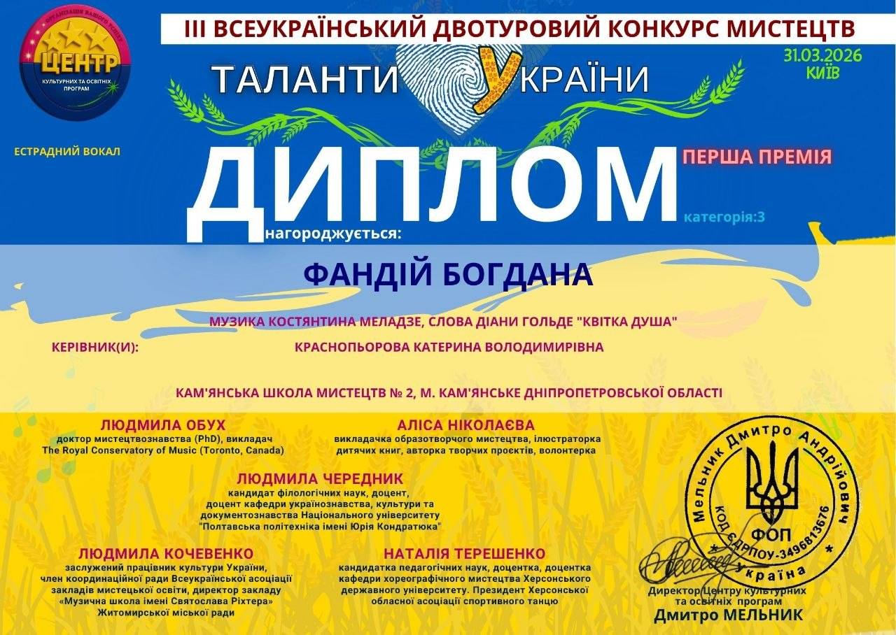 Искренние поздравления с блестящей победой принимает Богдана Фандий. Ученица Каменской школы искусств № 2 исполнила одну из самых нежных украинских песен “Квітка душа” и получила диплом (первая премия) в номинации “Естрадний вокал”. Выступление девочки поразило жюри гармоничным сочетанием вокального мастерства, национального колорита и искренности исполнения.