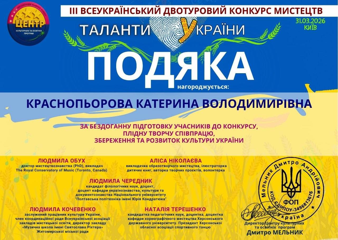 Конкурс подарил невероятную палитру впечатлений. Каждое выступление и творческая работа отличались своей уникальностью, мастерством исполнения и глубиной эмоций. Участники продемонстрировали не только техническую подготовку, но и настоящую любовь к искусству. Это еще раз подтверждает: украинские таланты – это мощная сила, источник вдохновения и залог большого будущего нашей культуры.