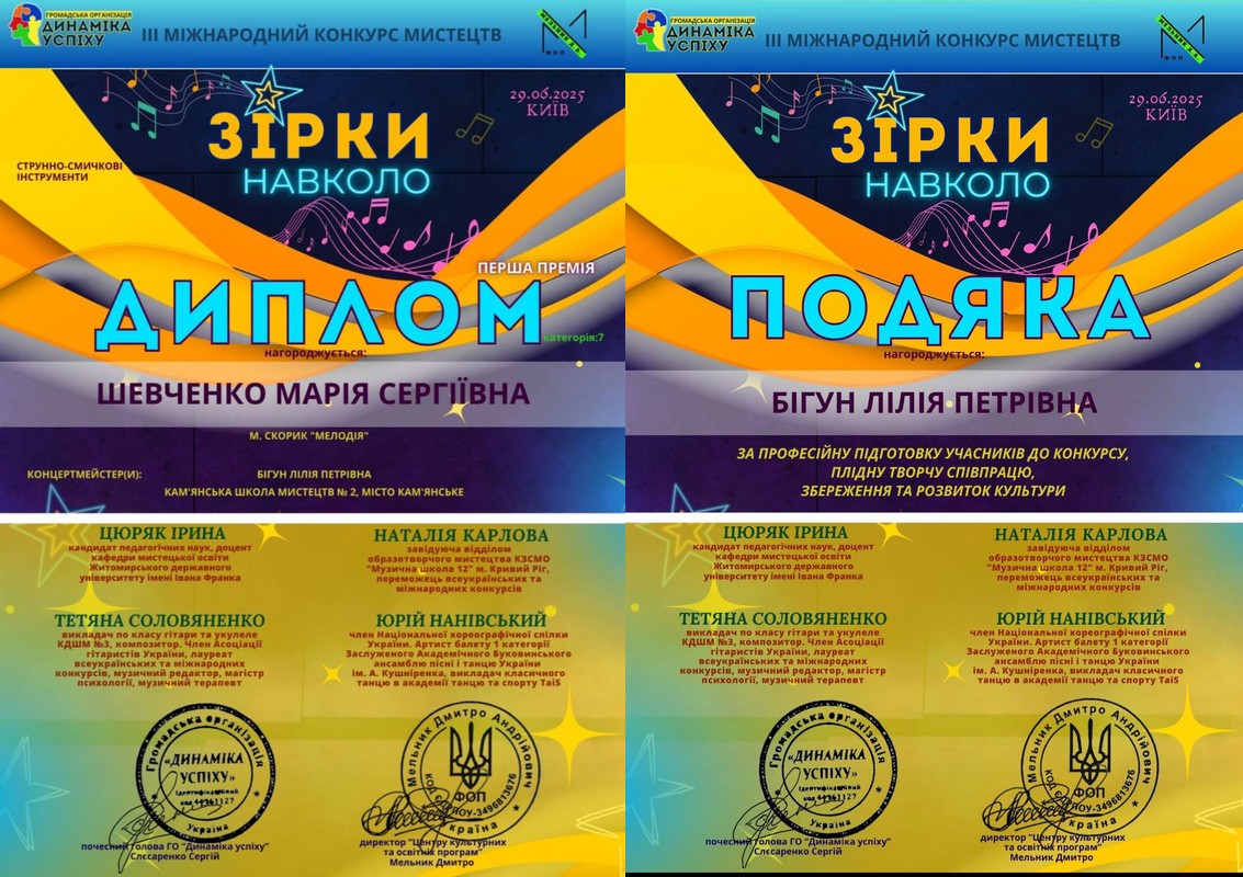 У Каменском не только ученики школ искусств, но и их наставники – яркие звезды, которые участвуют в творческих конкурсах и побеждают. Эта истина в очередной раз подтвердилась на III Международном конкурсе искусств “Зірки навколо“. Его организовала ОО “Динаміка успіху”.