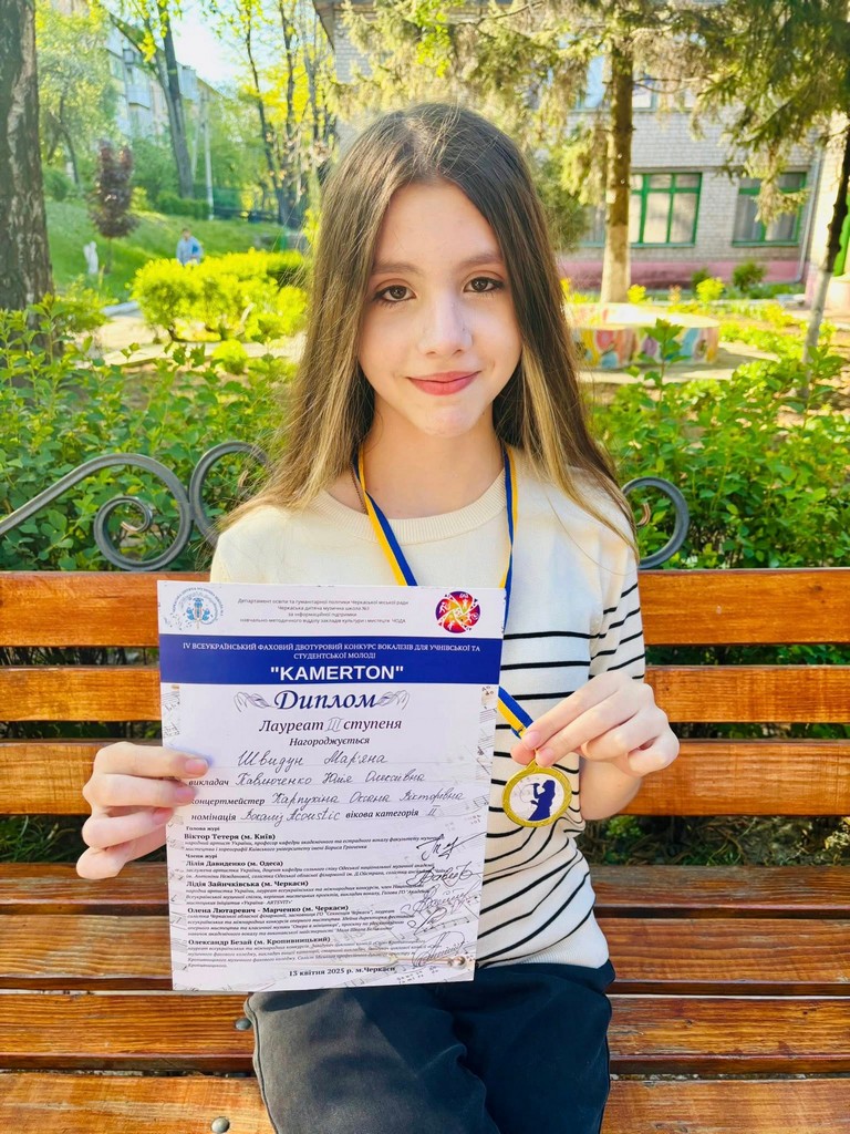 Ученица класса сольного пения Марьяна Швидун заняла призовое место на Всеукраинском профессиональном ученическом и студенческом конкурсах вокализов KAMERTON, который состоялся 13 апреля в Черкассах. Эти открытые престижные соревнования вокалистов проводятся ежегодно на базе Черкасской детской музыкальной школы № 3, согласно городской программе “Черкаські таланти”, при поддержке Департамента образования и гуманитарной политики ЧГС. Марьяна продемонстрировала высокий уровень мастерства и получила диплом лауреата ІІІ степени.