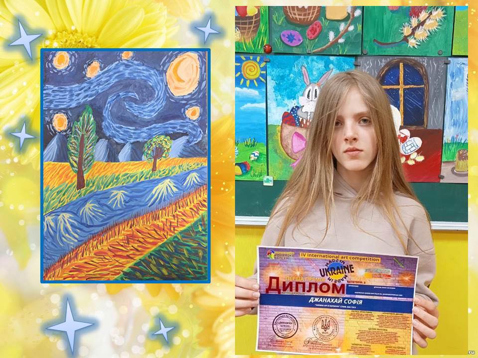 Еще одна юная художница Мария Язловецкая (также воспитанница Ирины Дзингель) покорила ІІІ Международный фестиваль-конкурс детского, юношеского и молодежного искусства Spring Talents. Его 12 апреля провела в Киеве ОО “Культурно-образовательное пространство “Старт-Арт”. Марии вручили диплом лауреата І степени. Ее талант и настойчивость были высоко оценены, а преподаватель получила заслуженную благодарность за весомый вклад в дело духовного возрождения, воспитания подрастающего поколения, популяризацию культуры и искусства и высокий профессионализм.
