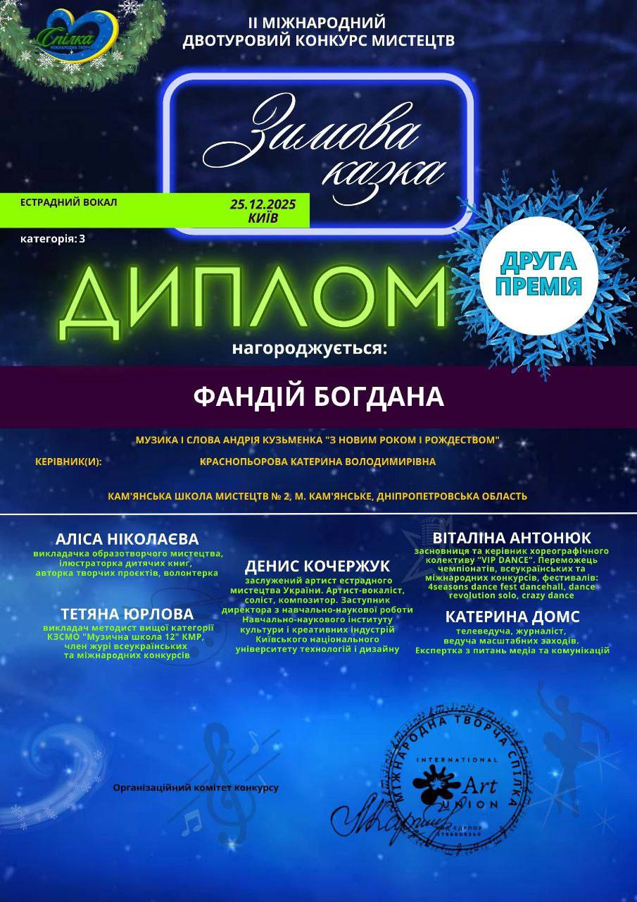 Богдана Фандий стала лауреатом II премии. Юная вокалистка исполнила песню “З Новим роком і Рождеством” (музыка и слова Андрея Кузьменко).