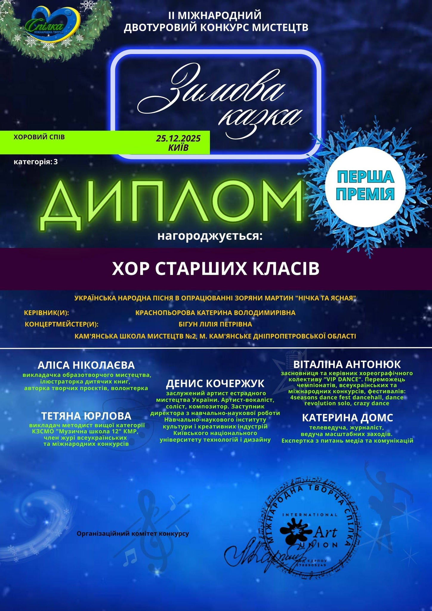 Хор старших классов удостоен звания лауреата I премии за исполнение украинской народной песни “Нічка та ясная” (в обработке Зоряны Мартин).
