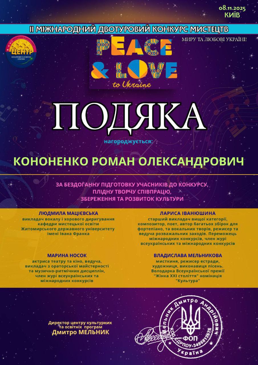 Преподаватель Роман Кононенко получил благодарность за безупречную подготовку участницы к конкурсу, плодотворное творческое сотрудничество, сохранение и развитие культуры.