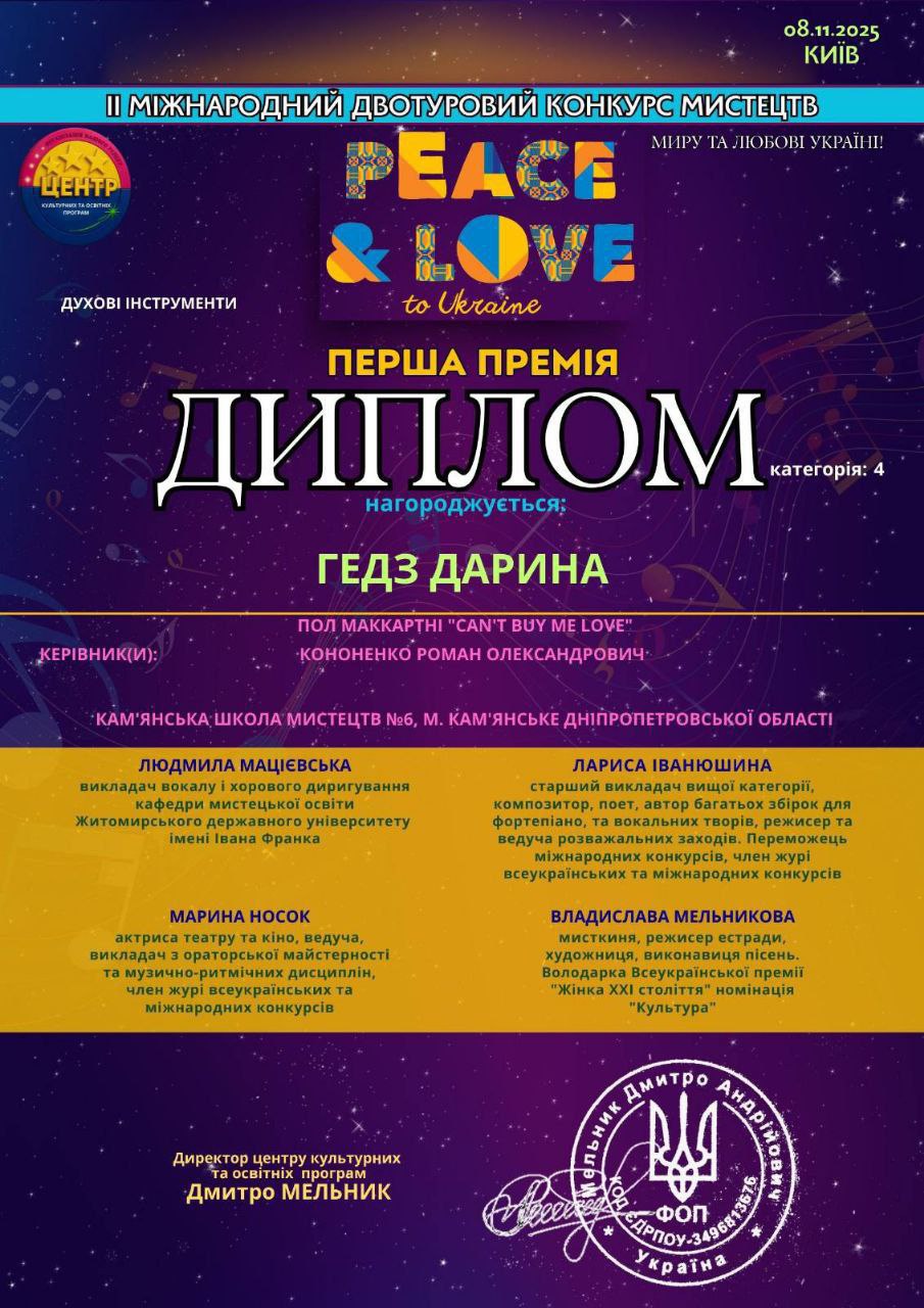 Дарина Гедз получила диплом I степени на II Международном двухтуровом конкурсе искусств Peace & Love to Ukraine, который состоялся 8 ноября. Организатором выступил Центр культурных и образовательных программ.