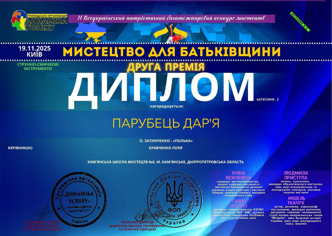 Дарья Парубец достойно представила школу искусств № 6 на II Всеукраинском патриотическом многожанровом конкурсе искусств “Мистецтво для Батьківщини“, который провела ОО “Динаміка успіху”. Юная скрипачка получила диплом II степени за исполнение произведения А. Затинченко “Полька”. Итоги конкурса подвели 19 ноября.