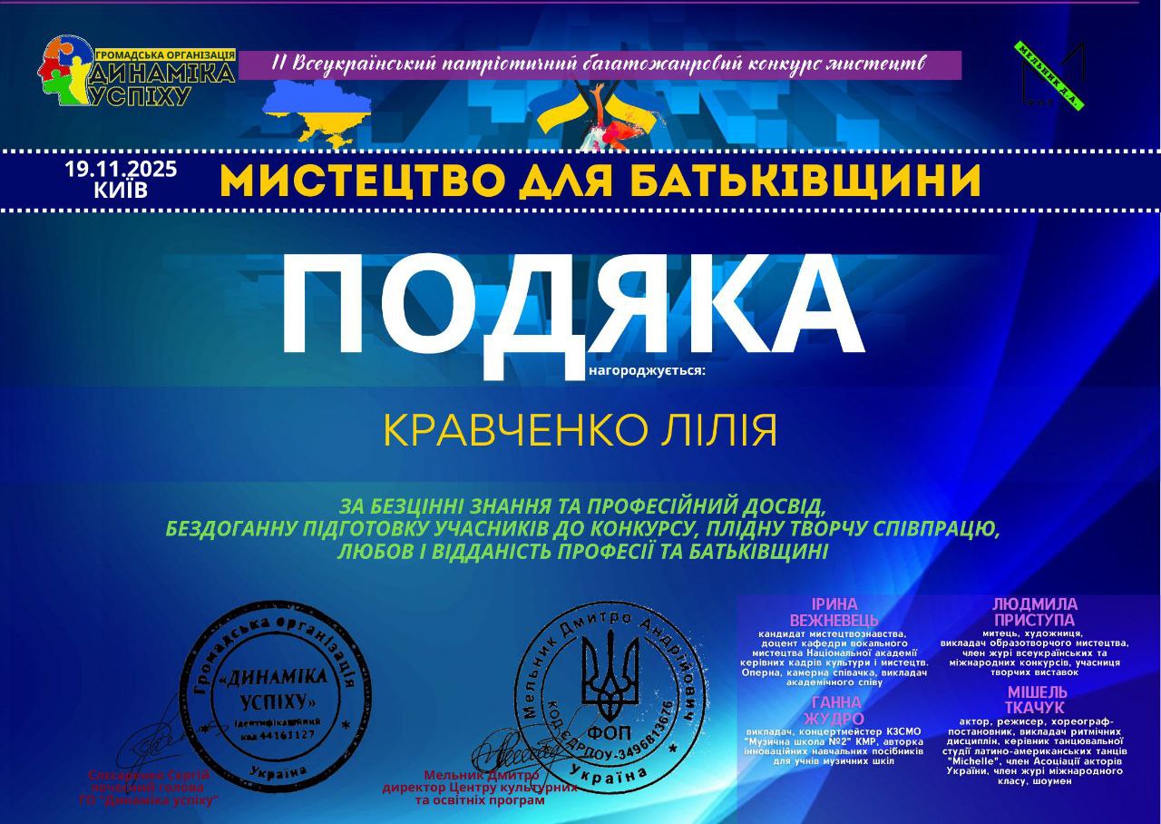 Преподаватель Лилия Кравченко отмечена благодарностью за бесценные знания и профессиональный опыт, безупречную подготовку участницы к конкурсу, плодотворное творческое сотрудничество, любовь и преданность профессии и Родине.