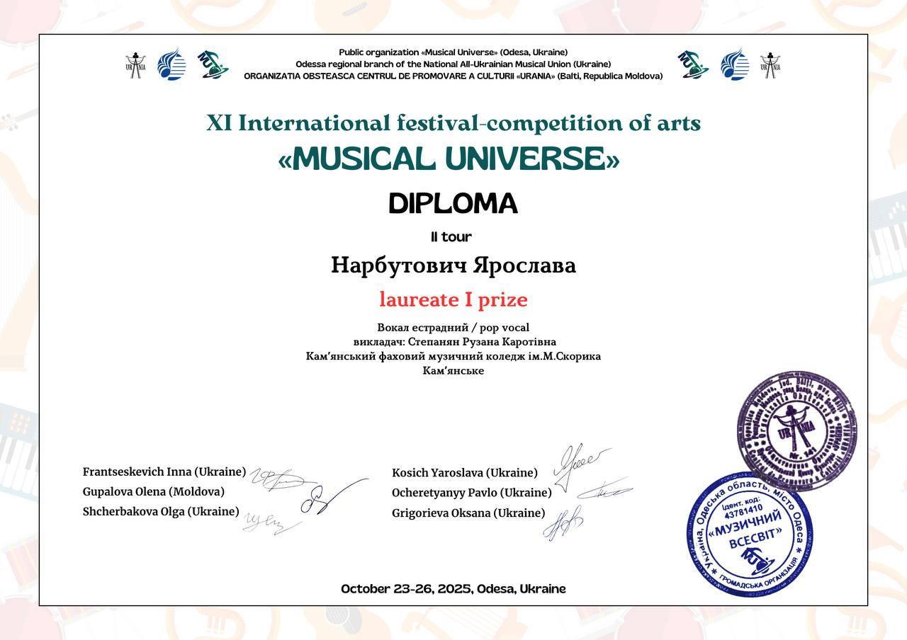 В номинации “Современный вокал” высокую оценку получила ученица Каменского профессионального музыкального колледжа имени Мирослава Скорика Ярослава Нарбутович. Выступление девушки было отмечено самым высоким баллом среди всех конкурсантов, что заслуженно принесло ей І лауреатское место.