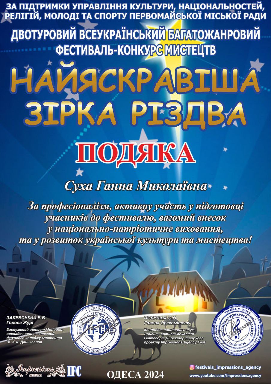 Преподаватель Анна Николаевна Сухая получила благодарность за профессионализм, активное участие в подготовке участницы к фестивалю, весомый вклад в национально-патриотическое воспитание и развитие украинской культуры и искусства.