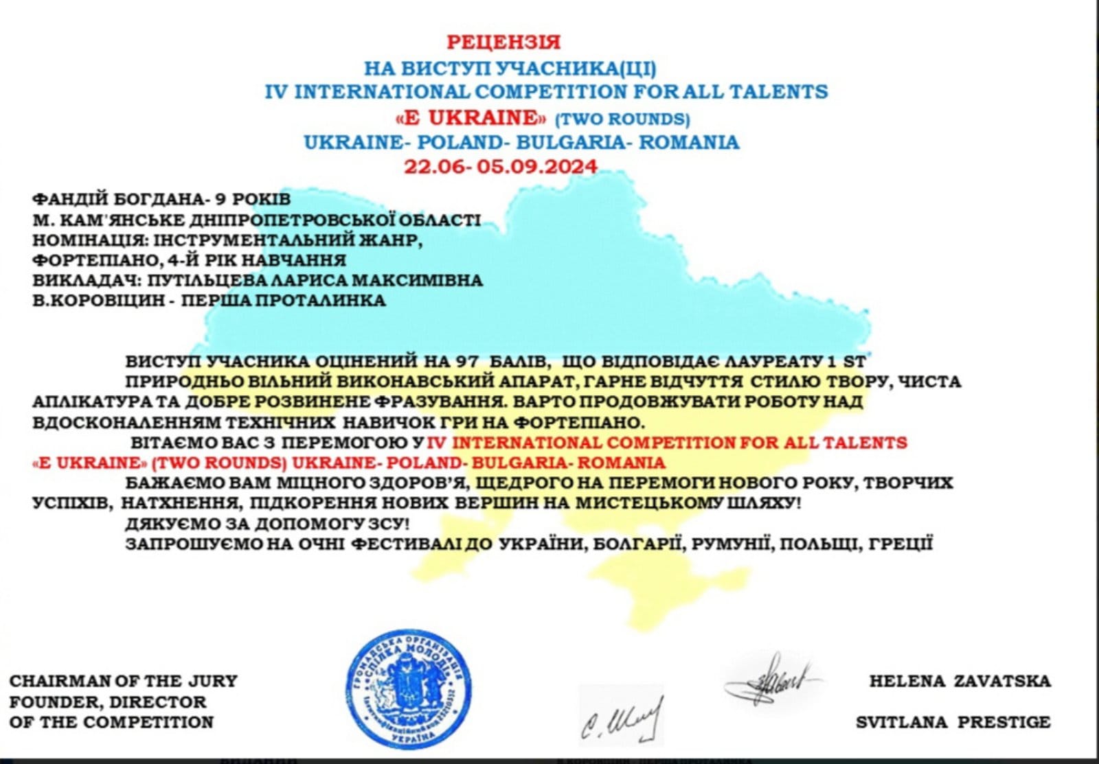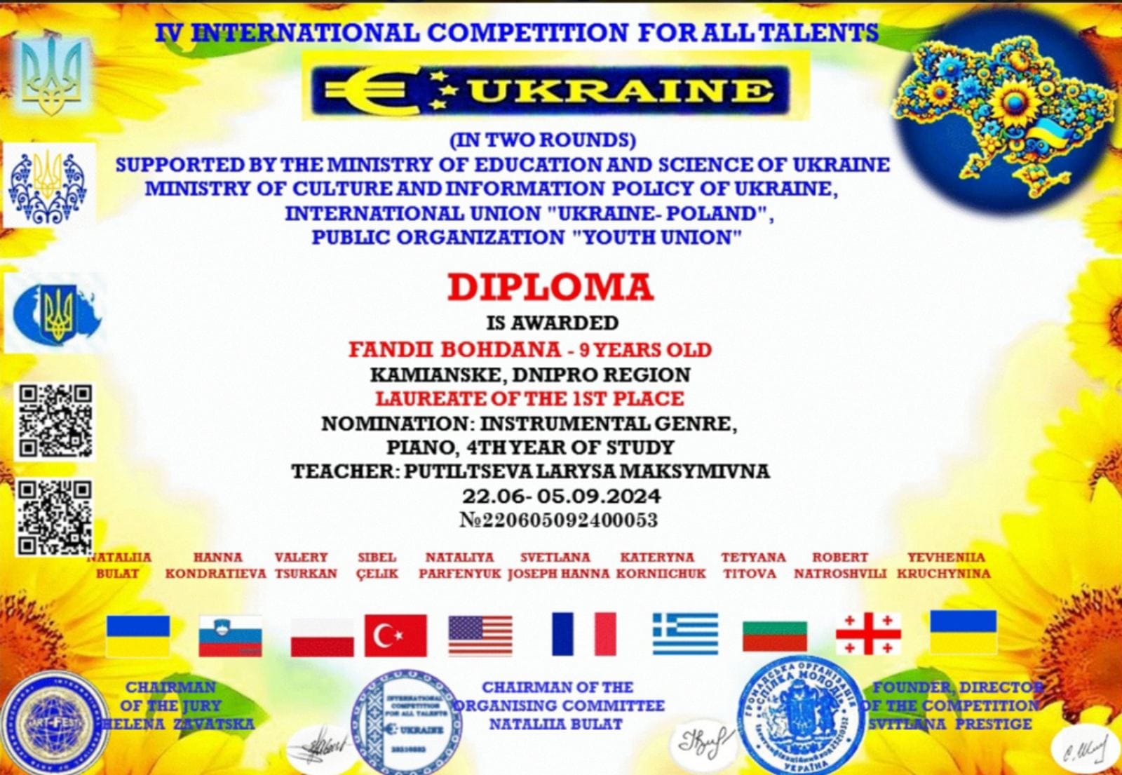 Девочка победила на IV Международном многожанровом двухтуровом благотворительном фестивале искусств “Є Україна!”. Творческое мероприятие, посвященное Дню Независимости, проводилось с 22 июня по 5 сентября.