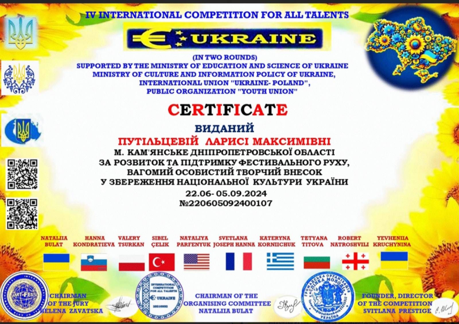 Преподаватель Лариса Путильцева получила сертификат за развитие и поддержку фестивального движения, весомый личный творческий вклад в сохранение национальной культуры Украины.