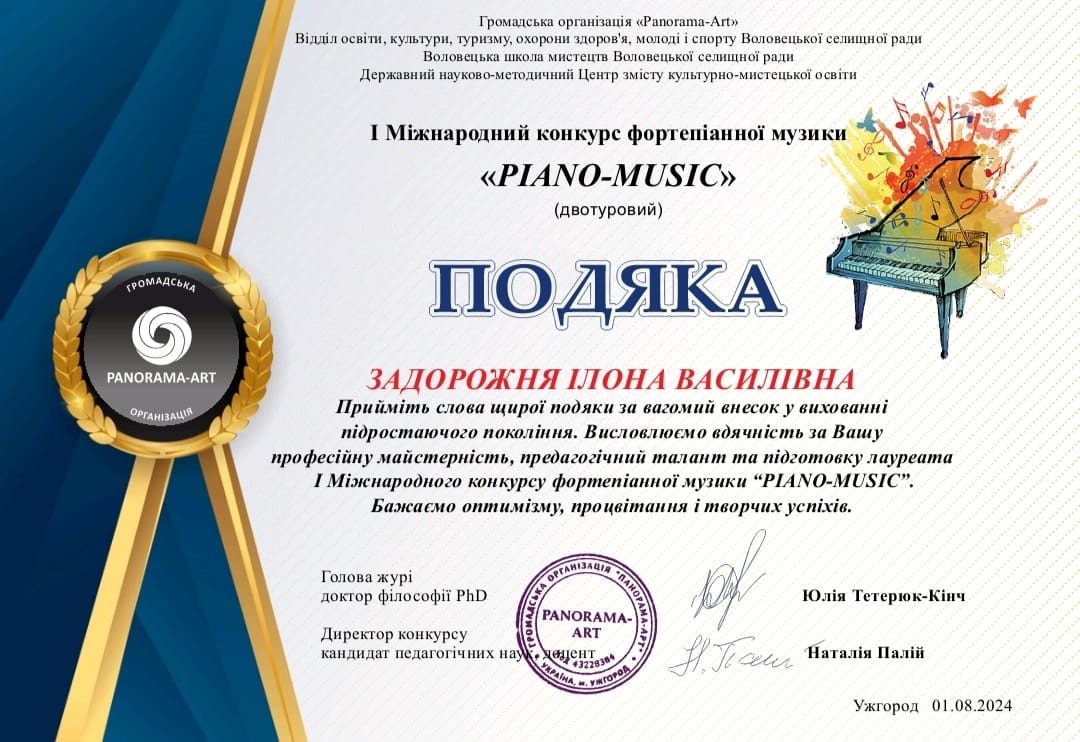 Одаренная девочка приняла участие в I Международном конкурсе фортепианной музыки Piano Music. Его учредитель – общественная организация Panorama-Art. Творческое мероприятие состоялось 1 августа в Ужгороде. Профессиональное жюри оценивало выступления музыкантов (солисты, дуэты, трио, ансамбли) из разных городов Украины.