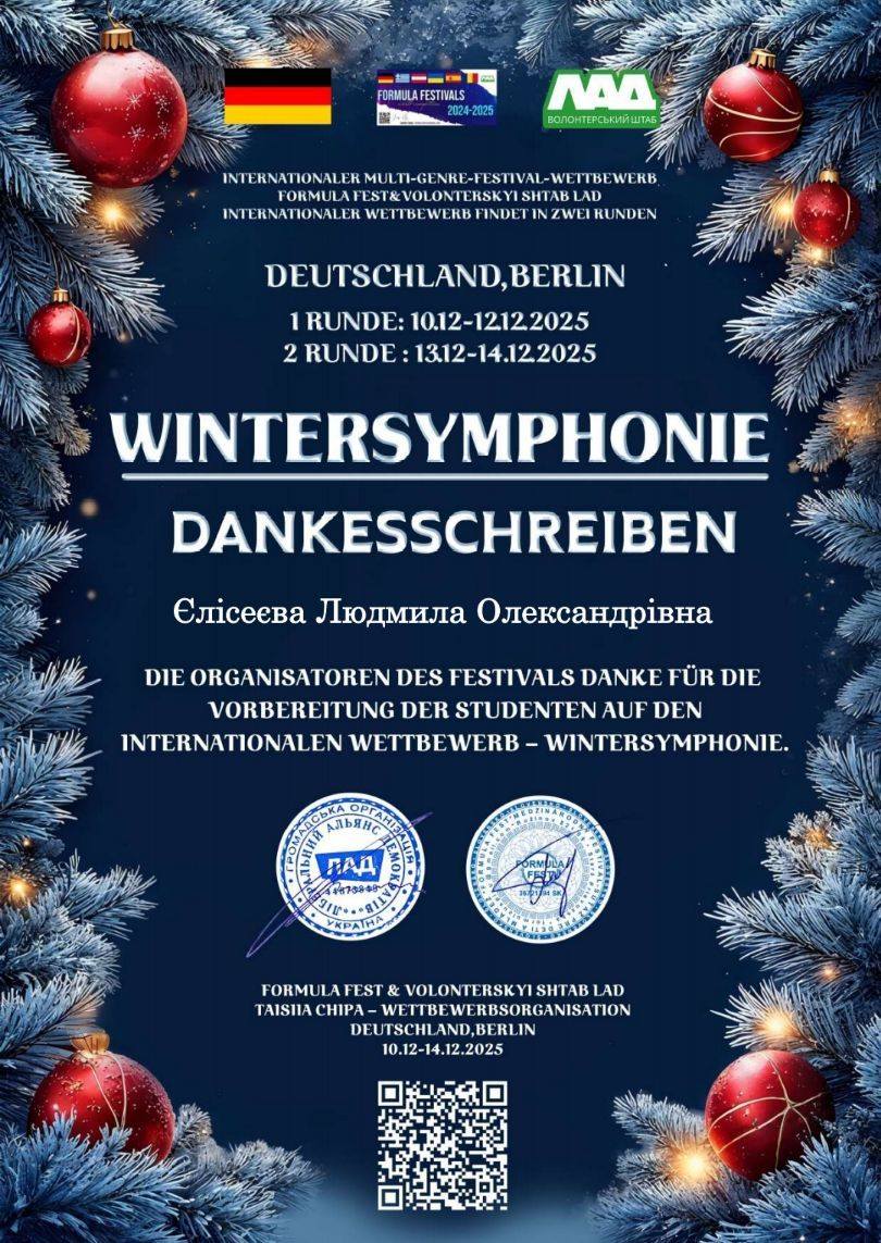 Копилка достижений заведений пополнилась еще одной важной наградой. Недавно в Берлине состоялся престижный Международный многожанровый двухтуровый фестиваль-конкурс WINTERSYMPHONIE. «Зимняя симфония» объединила талантливых исполнителей из разных стран мира.