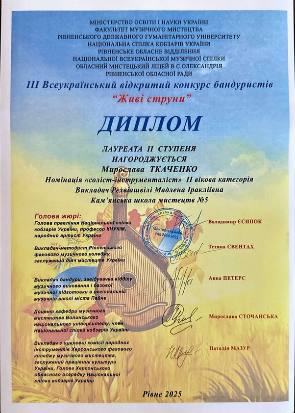 Ученицы Каменской школы искусств № 5 приняли участие в III Всеукраинском открытом конкурсе бандуристов “Живі Струни”, который состоялся в Ровно.