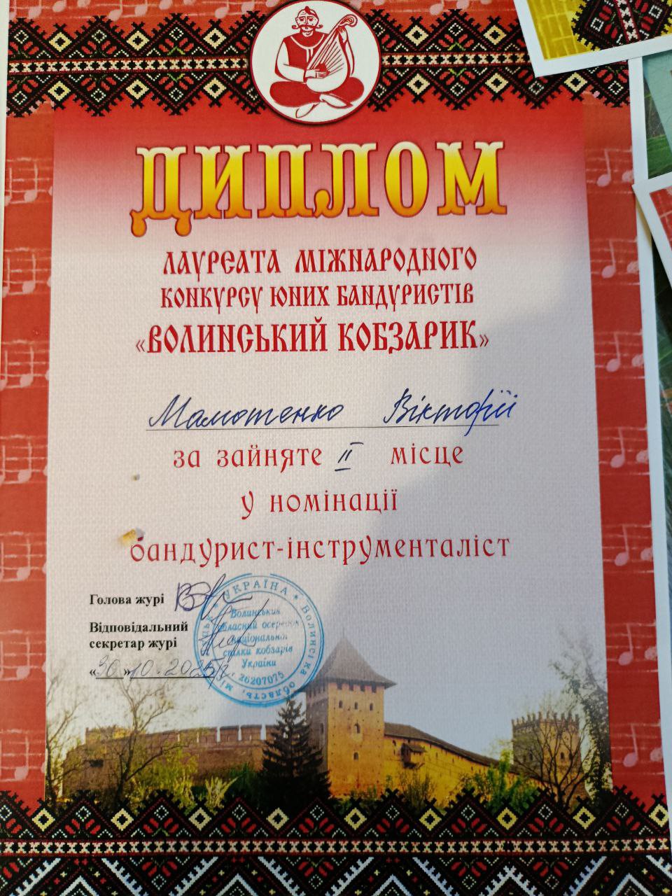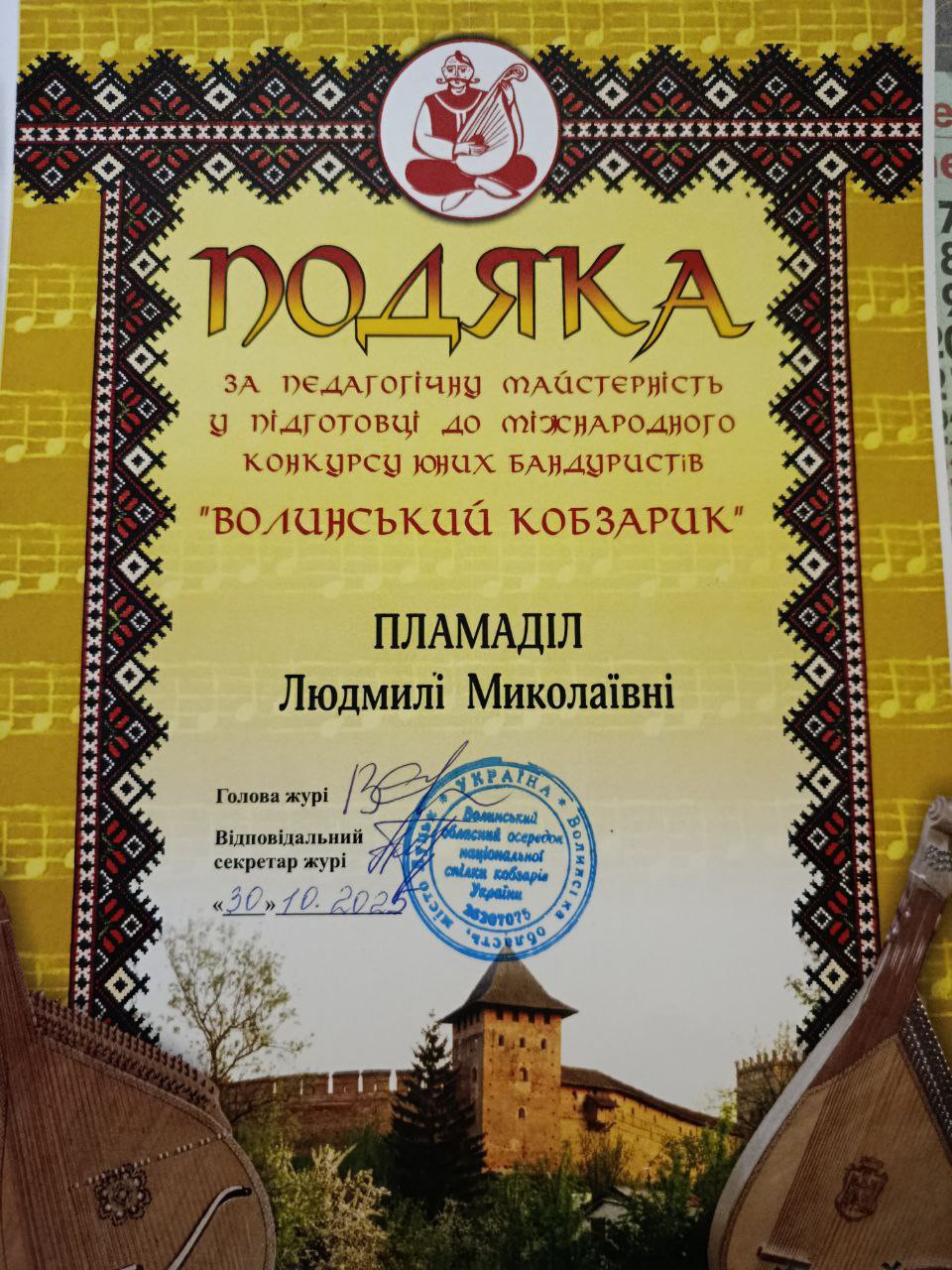Преподавателя Людмилу Пламадил отметили благодарностью за педагогическое мастерство в подготовке к конкурсу “Волинський кобзарик”.