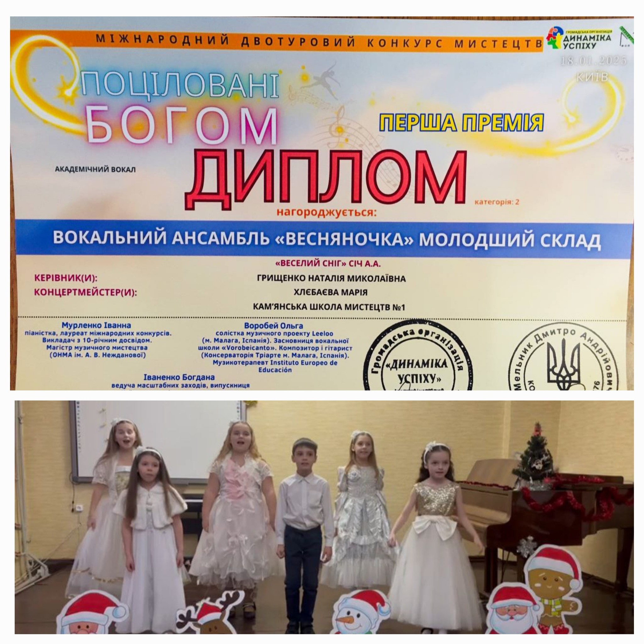 В январе состоялся Международный двутурный конкурс искусств “Поціловані Богом” (Киев). Вокальный ансамбль “Весняночка” (младший и старший составы) стали лауреатами I премии (руководитель Наталья Грищенко, концертмейстер Мария Хлебаева).