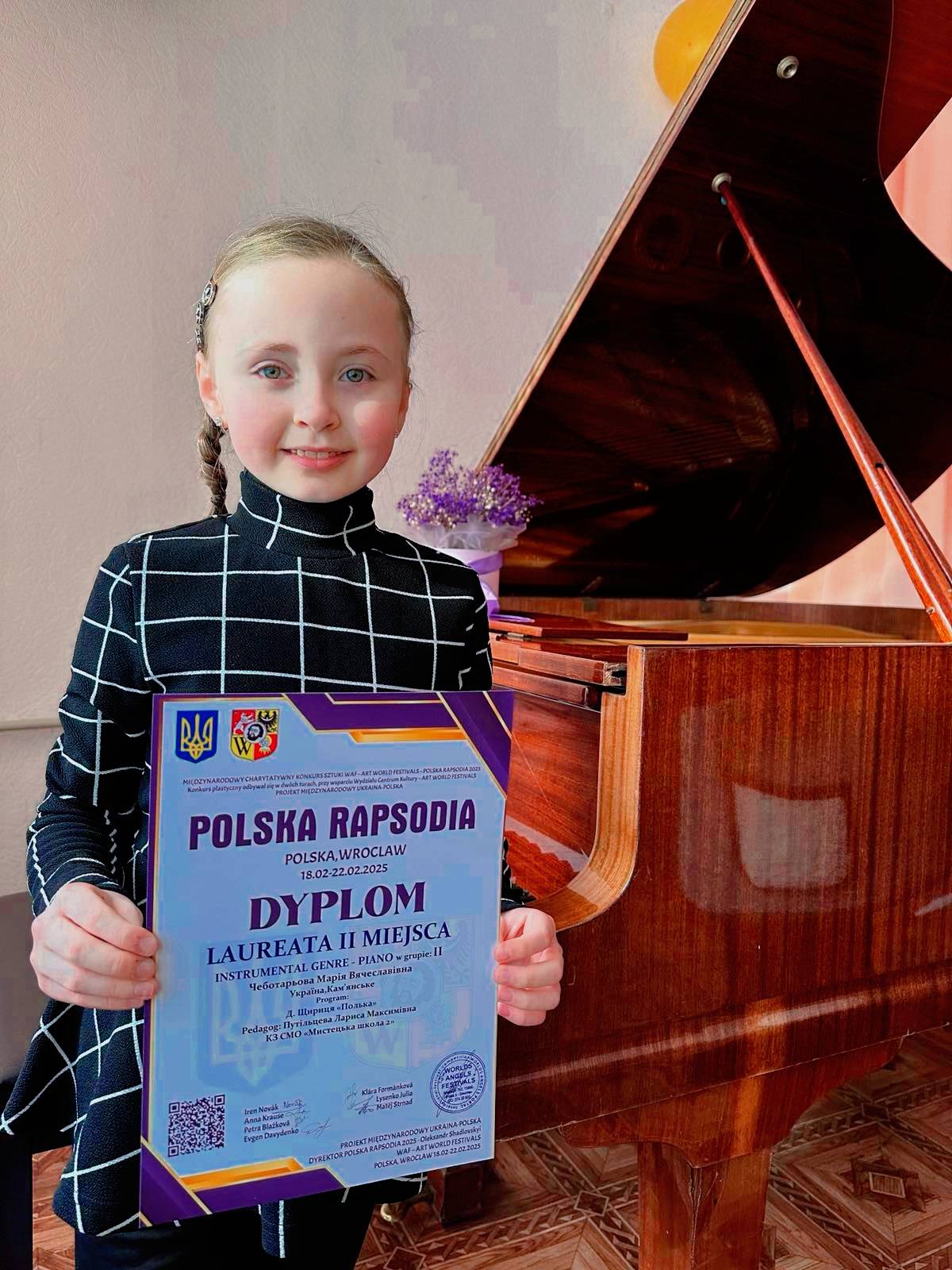 Отметим успех юной пианистки Марии Чеботаревой. Ученица школы искусств заняла второе место на Международном конкурсе искусств Polska Rapsodia. Его итоги подвели 18 февраля в польском Вроцлаве. Девочка играла на фортепиано “Польку” Д. Щирицы. Маше вручили награду – диплом лауреата в номинации “Инструментальный жанр. Фортепиано”.