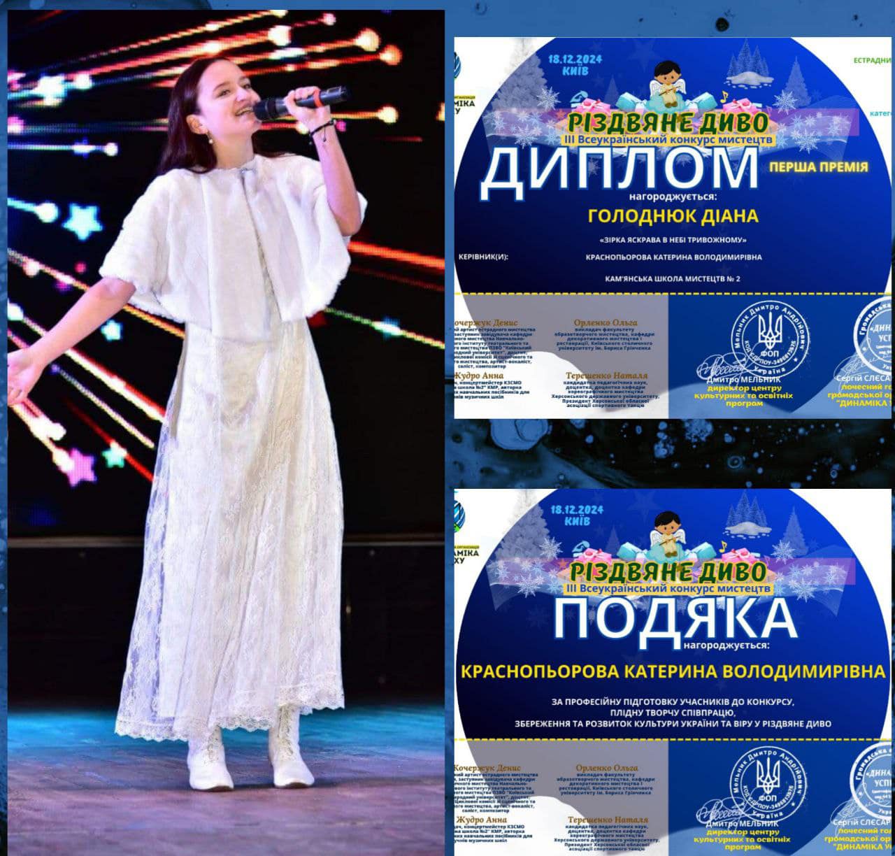 Преподаватель Екатерина Красноперова и концертмейстер Лилия Бигун получили благодарности от организаторов за профессиональную подготовку участников к конкурсу, плодотворное творческое сотрудничество, сохранение и развитие культуры Украины и веру в рождественское чудо.