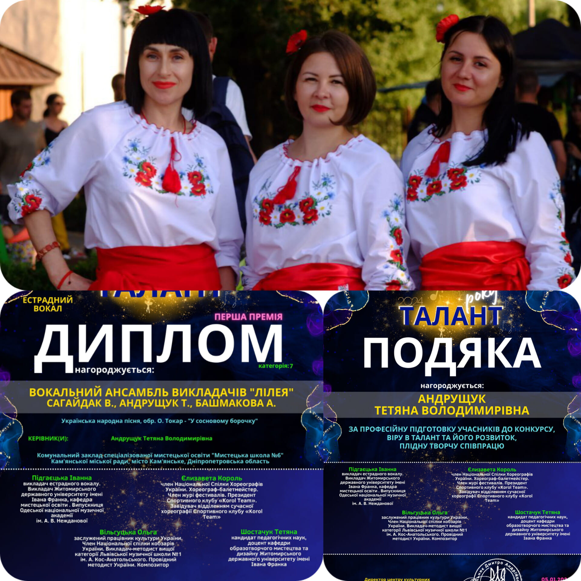 - вокальный ансамбль преподавателей “Лилея” (рук. Татьяна Андрущук) – диплом I степени;