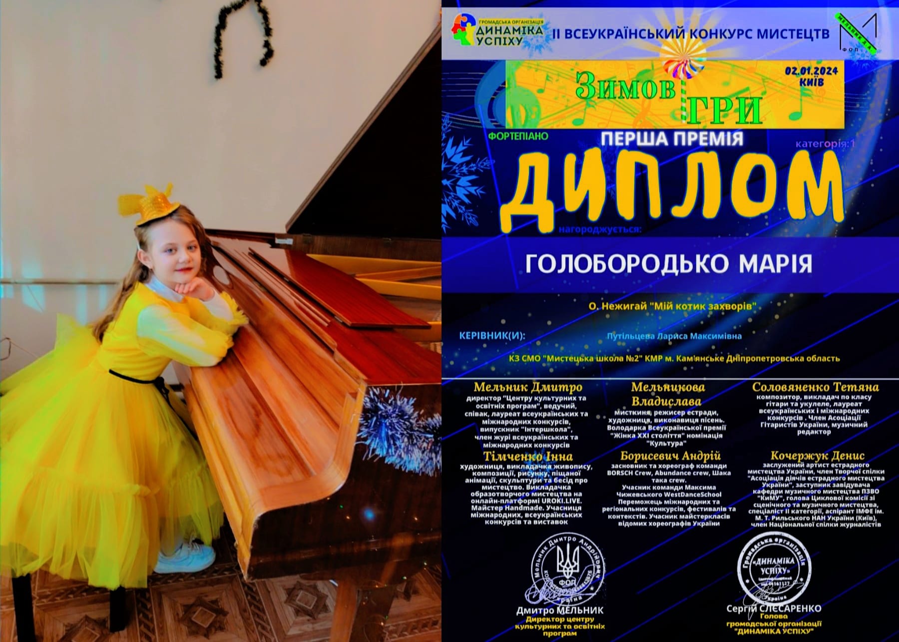 Ученица фортепианного отдела Мария Голобородько отмечена дипломом первой премии за участие во II Всеукраинском конкурсе искусств “Зимові ігри“, который состоялся 2 января в Киеве.
