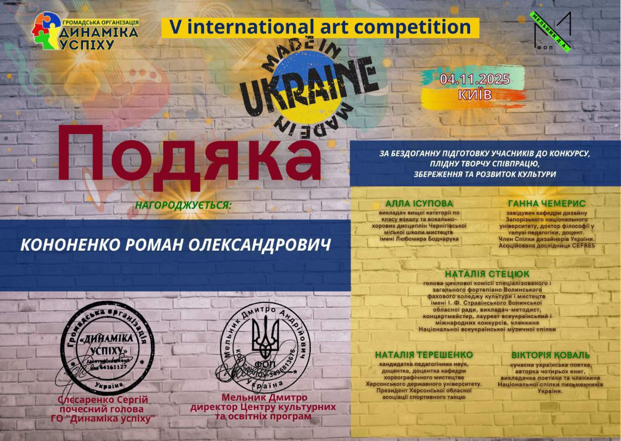 Под вдохновенным и высокопрофессиональным руководством своего преподавателя Романа Кононенко Ярослава продемонстрировала не только великолепную технику исполнения, но и невероятную эмоциональную глубину в своем выступлении, которое покорило сердца жюри. Педагог получил благодарность за безупречную подготовку участницы к конкурсу, плодотворное творческое сотрудничество, сохранение и развитие культуры.