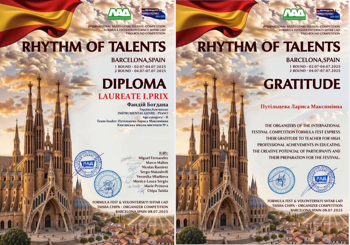 Среди плеяды ярких звезд, сошедших на музыкальном небосклоне RHYTHM OF TALENTS, засияла юная пианистка из Каменского. Ученица фортепианного отдела школы искусств № 2 Фандий Богдана достойно представила учебное заведение. Она соревновалась во II возрастной категории, где её исполнительское мастерство получило высокие оценки от специалистов. Богдана не просто покорила, а буквально очаровала жюри своей интерпретацией музыкальной композиции Николая Лысенко – вариации на тему известной украинской песни “Ніч, яка місячна”. Выступление девочки, полное глубины и эмоциональности, принесло ей диплом за I место.
