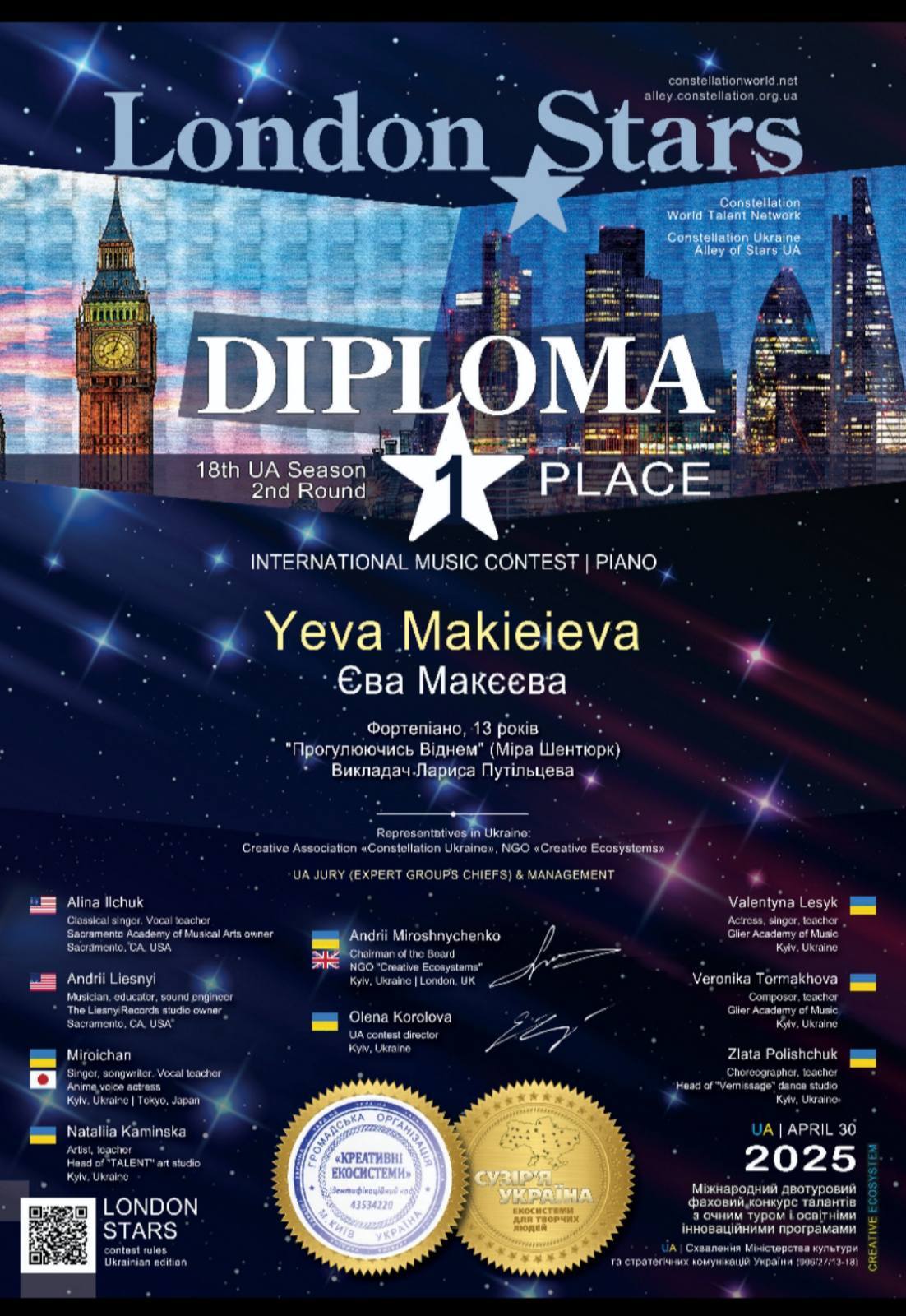 В мае состоялся Международный двухтуровый конкурс London Stars (18-й сезон). Это престижное мероприятие, организованное компанией “Алея зірок України”, является не просто соревнованием, а комплексной творческой и образовательной программой. Ее цель – не только выявить одаренных участников, но и активно поддерживать их развитие, способствовать публикации и продвижению их работ, а также обеспечивать признание их талантов.