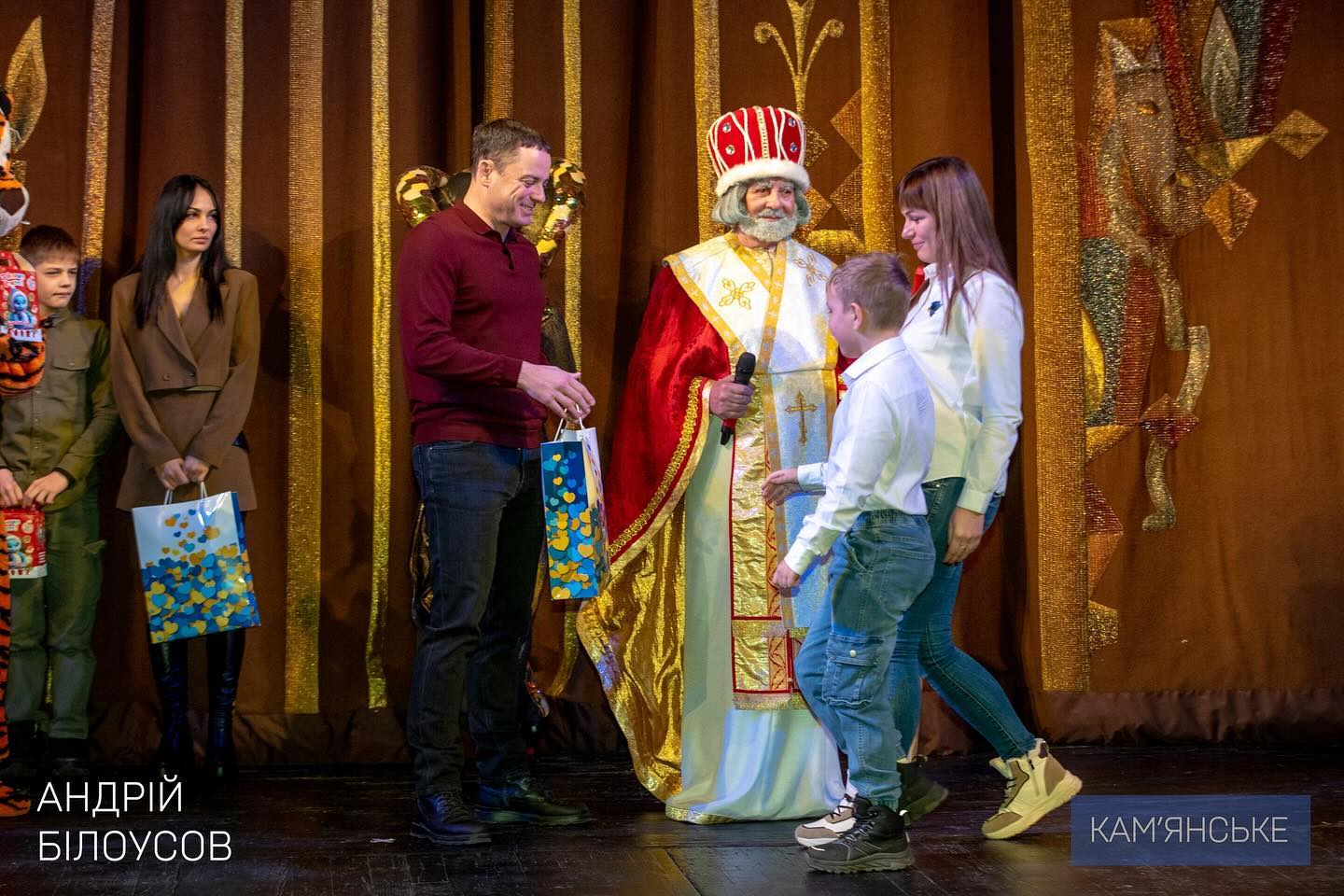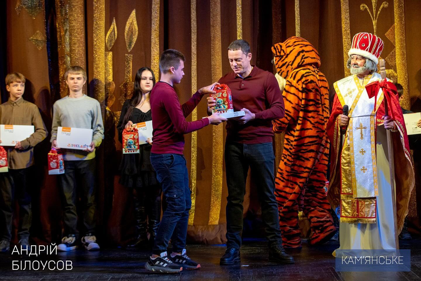 Мэр Каменского Андрей Белоусов передал от Николая сладкие подарки, а за отличную учебу вручил детям планшеты и другие полезные гаджеты. Надежные помощники святого Николая – БФ “Каритас Каменское” – подготовили подарки для детей наших павших Героев. Особую атмосферу создал праздничный спектакль.