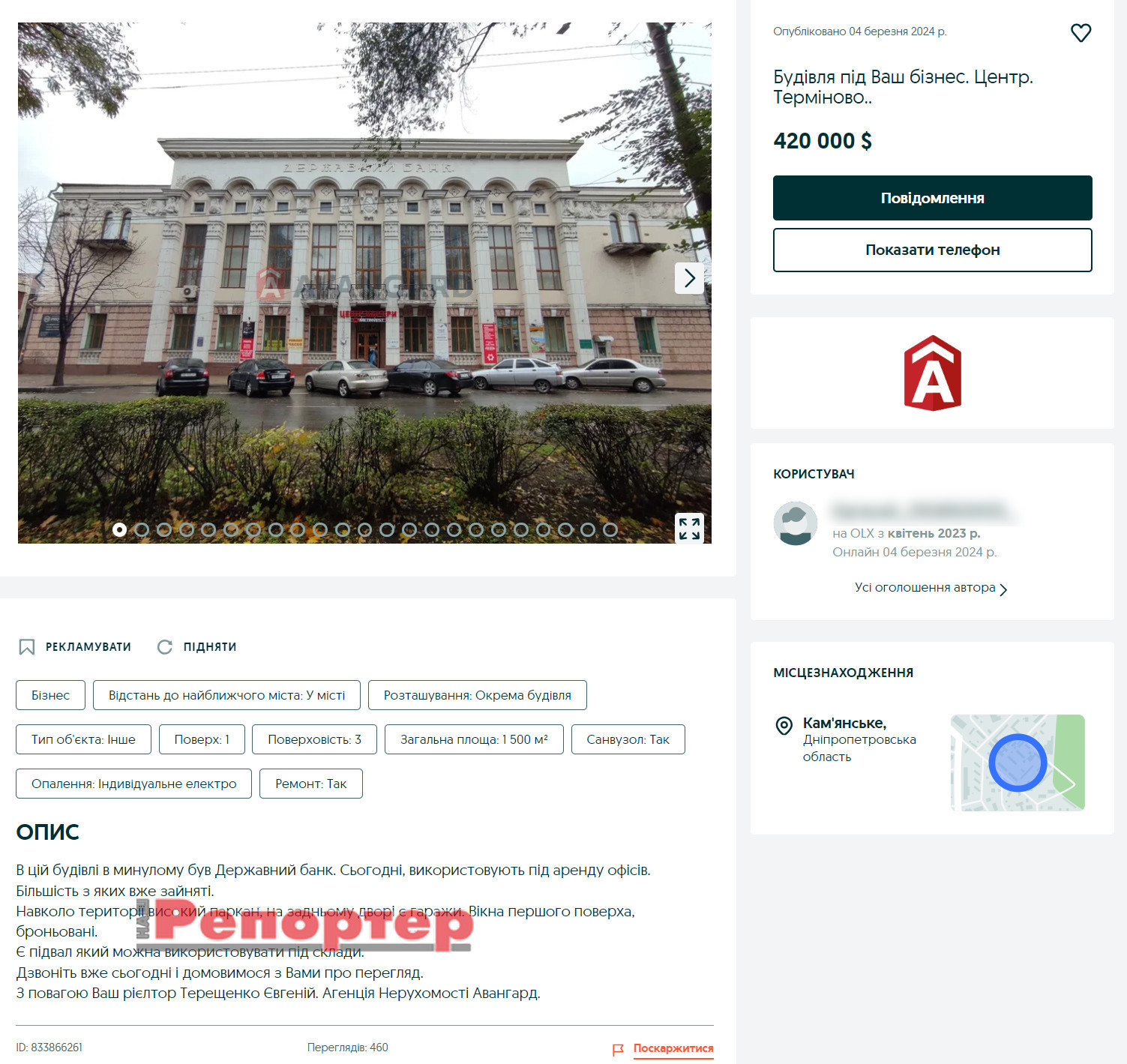 Объявление о продаже трехэтажного здания на проспекте Свободы, 2, появилось на OLX 4 марта. Объект оценили в 420 000 дол. США.