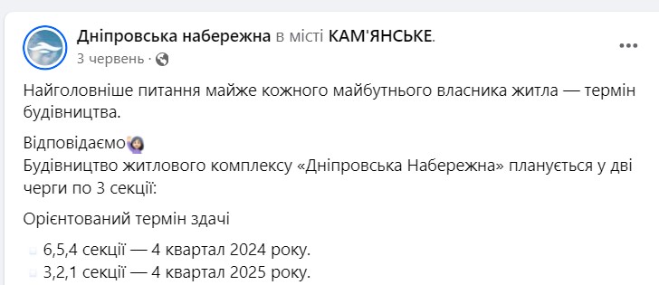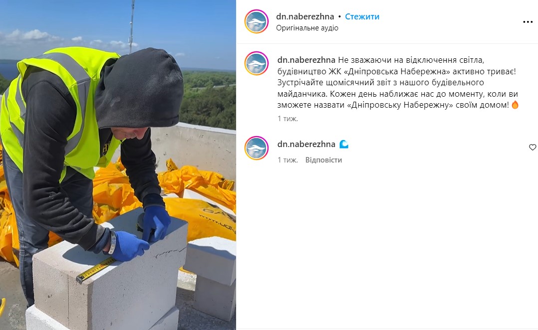 На официальных каналах застройщика 16 августа сообщается следующее: “Незважаючи на відключення світла, будівництво ЖК “Дніпровська Набережна” активно триває!”
