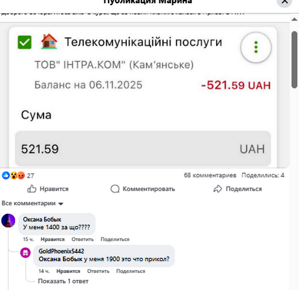 Суть проблемы такова. В начале ноября в приложении “Приват-24” (раздел коммунальные платежи) у значительного количества горожан появился долг перед ООО «ІНТРА.КОМ» за телекоммуникационные услуги. Как понял журналист, речь идет о кабельном телевидении.