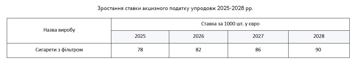 Закон предусматривает постепенное, в течение 4 лет, повышение ставок акцизного налога на сигареты до достижения минимального уровня, установленного директивой 2011/64/ЕС с учетом евроинтеграционных обязательств Украины. Также ставки акциза для табачных изделий будут определяться в евро.