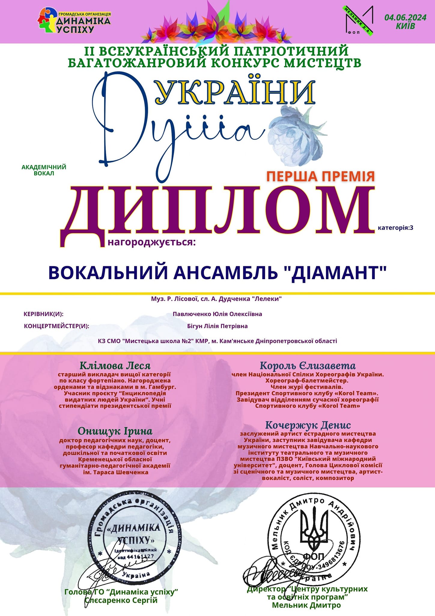Руководитель “Діамантів” Юлия Павлюченко и концертмейстер Лилия Бигун отмечены благодарностями за профессиональную подготовку участников к конкурсу, плодотворное сотрудничество, сохранение и развитие культуры.