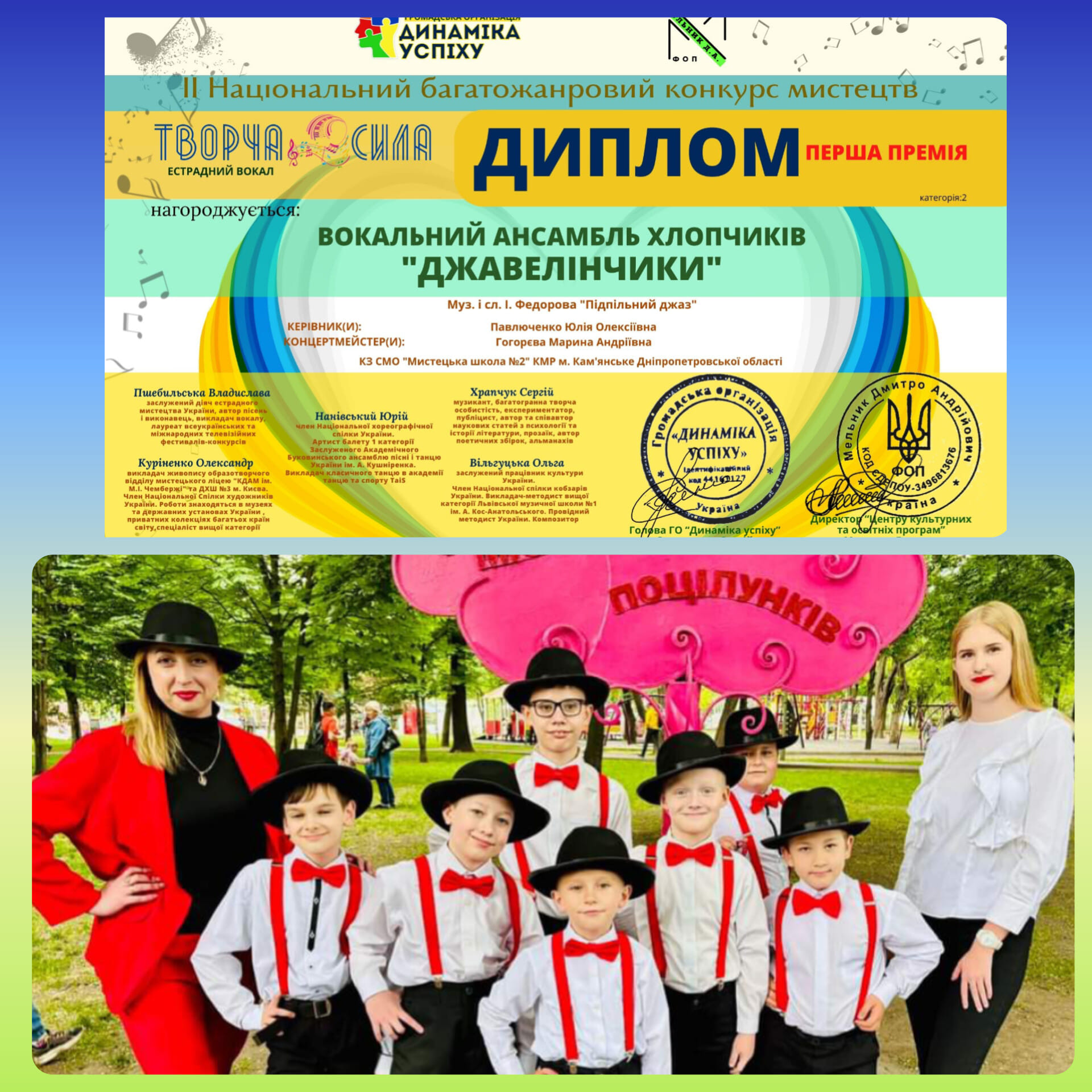 Не отстает и вокальный ансамбль мальчиков “Джавелінчики”. Их номер “Підпільний джаз” (музыка и слова И. Федоровой) высоко оценило жюри II Национального многожанрового конкурса искусств “Творча сила”, который проводился 3 июня в Киеве (организатор также ОО “Динаміка успіху”). “Джавелінчики” стали дипломантами I премии в номинации “Эстрадный вокал”.