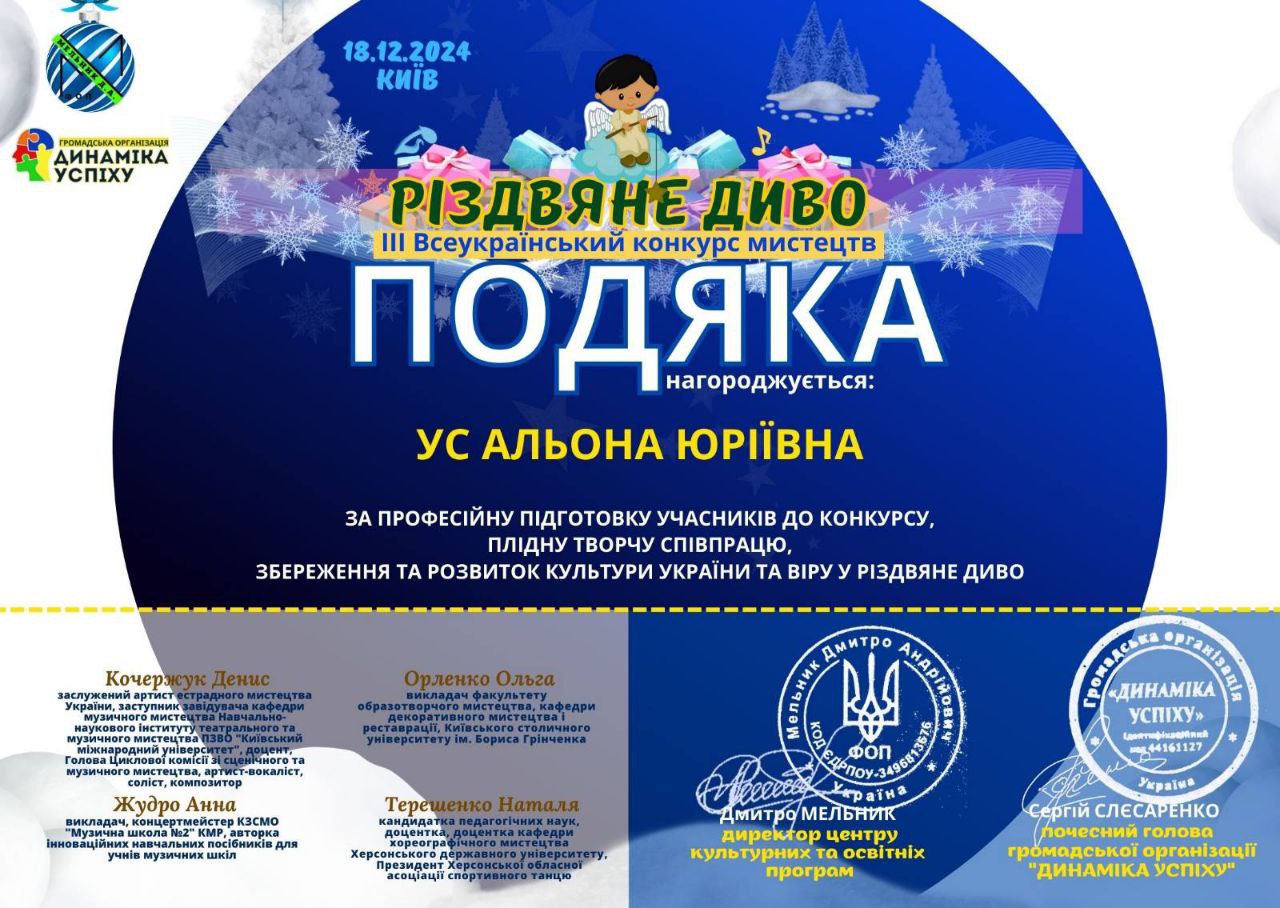 Преподаватель получила благодарность организаторов за профессиональную подготовку участников к конкурсу, плодотворное творческое сотрудничество, сохранение и развитие культуры Украины и веру в рождественское чудо.