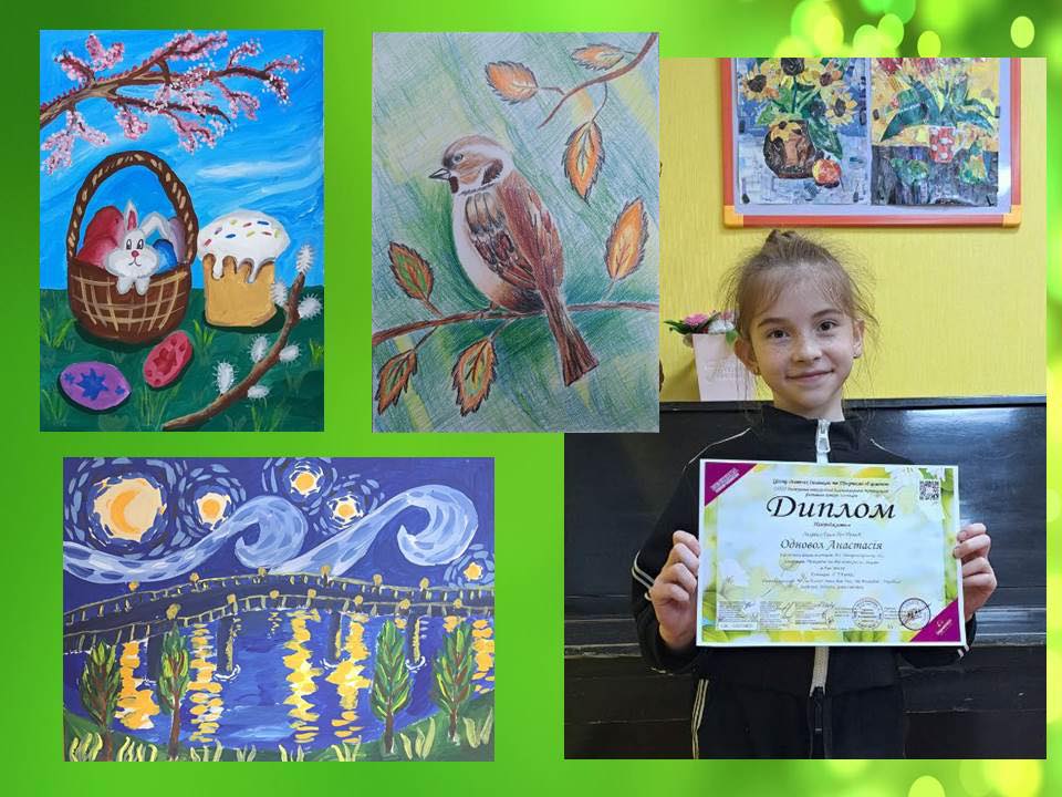 Настоящей звездой конкурса стала Анастасия Одновол, которая завоевала наивысшую награду – диплом лауреата Гран-при. Ее впечатляющие творческие работы продемонстрировали разносторонность и глубину художественного видения: “Ніч на Дніпрі”, выполненная в стиле Ван Гога, “На Великдень” и “Горобчик”. Каждая картина – это отдельная история, рассказанная цветом и линиями.