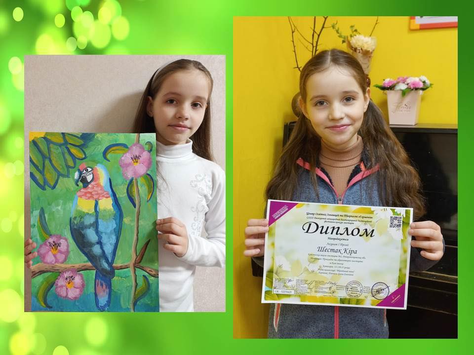 Не менее значимым является результат Киры Шестак, получившей диплом лауреата І премии за свою яркую и выразительную творческую работу “Тропічний птах”. Эта победа свидетельствует об уверенном владении техникой и умении передать красоту природы.