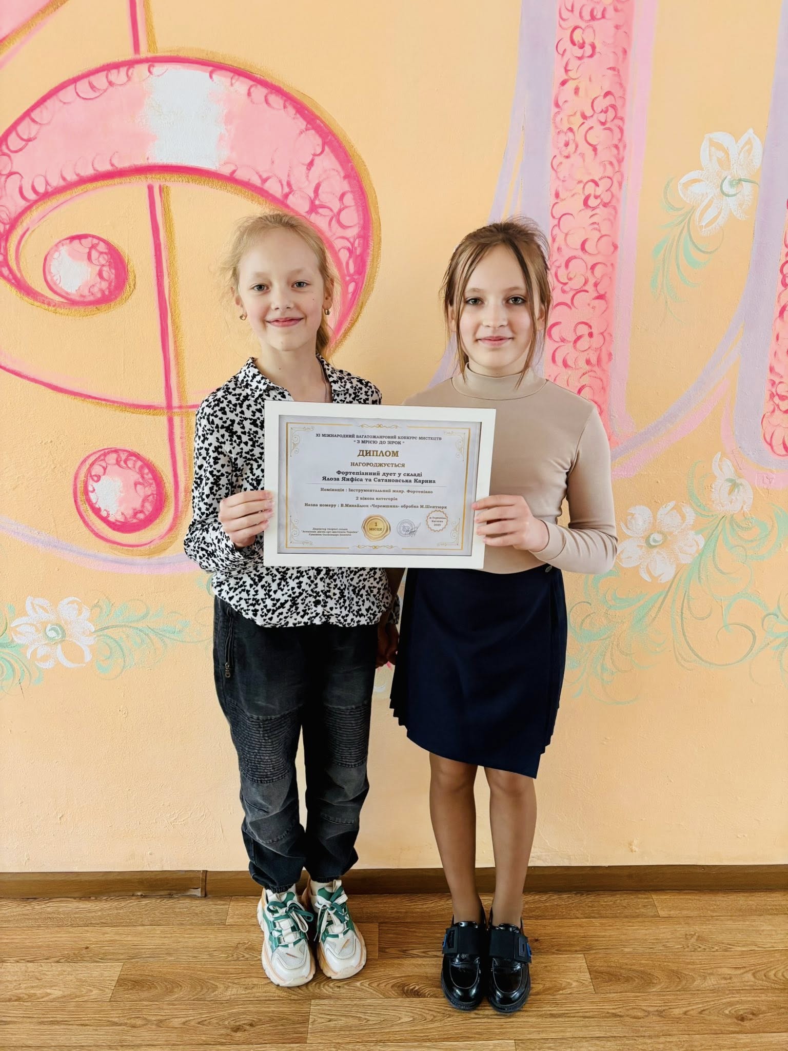 Фортепианный дуэт в составе Карины Сатановской и Анфисы Ялозы продемонстрировал жюри свое гармоничное и слаженное исполнение ансамбля В. Михайлюка “Черемшина” в обработке Миры Шентюрк. Их музыкальное взаимодействие и виртуозность были высоко оценены, принеся дуэту І место.