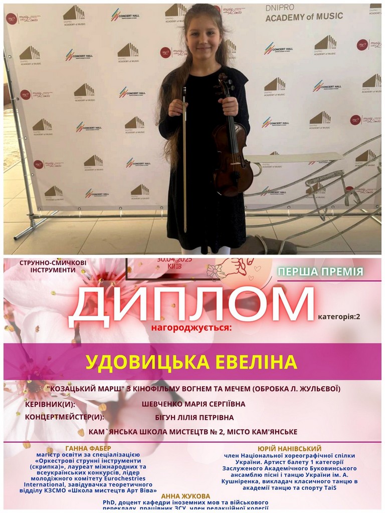 Класс скрипки на этом конкурсе блестяще представила Эвелина Удовицкая. Ее выступление было настолько убедительным, что решением высококвалифицированного жюри, в состав которого входили заслуженные деятели культуры и искусств Украины, девочка завоевала почетное І место.