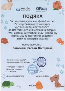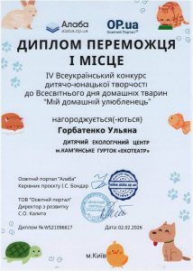 Ульяна Горбатенко, участница кружка «ЭКОТЕАТР» в Детском экологическом центре, одержала замечательную победу в конкурсе детско-юношеского творчества «Мій домашній улюбленець». Мероприятие, проходившее в Киеве, было приурочено ко Всемирному дню домашних животных (отмечается 30 ноября).