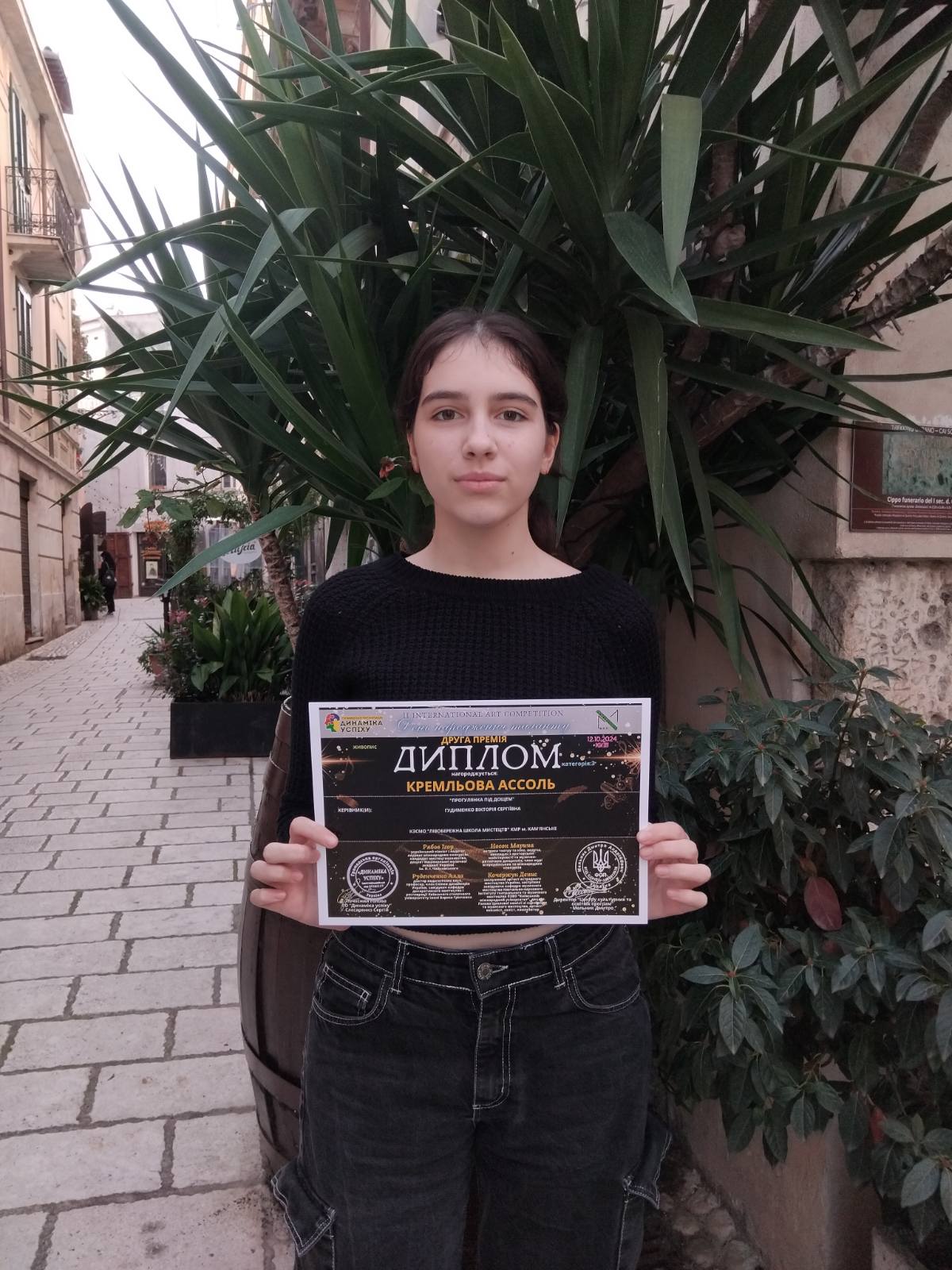 Ученица художественного отделения каменской Левобережной школы искусств Ассоль Кремлева приняла участие в конкурсе и получила диплом ІІ премии в номинации “Живопись”. Ее работа называется “Прогулянка під дощем”.