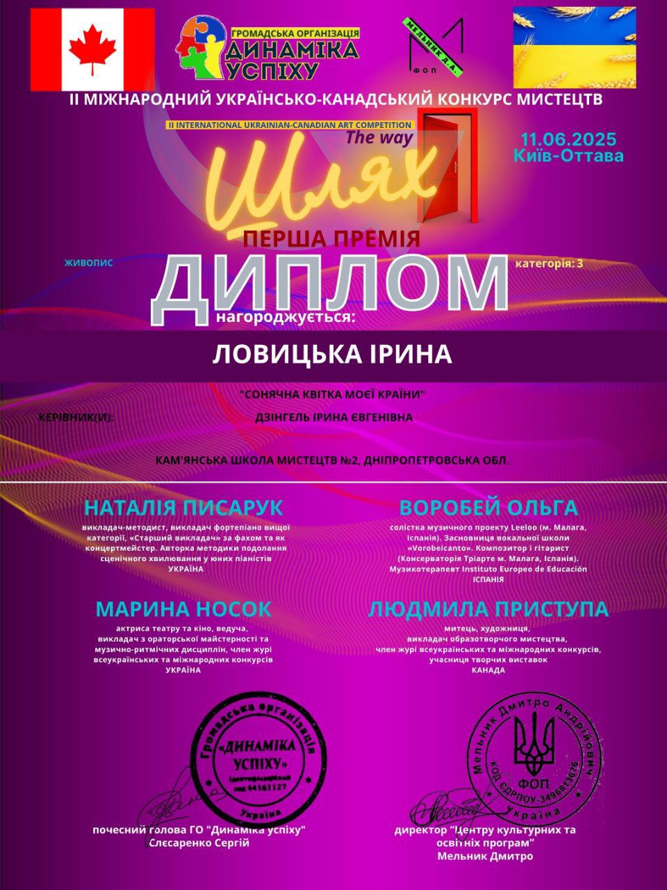 Юная художница заняла первое место по итогам II Международного украинско-канадского конкурса искусств «Шлях» (Киев – Оттава), который состоялся 11 июня. Организатором выступила ОО «Динаміка успіху».